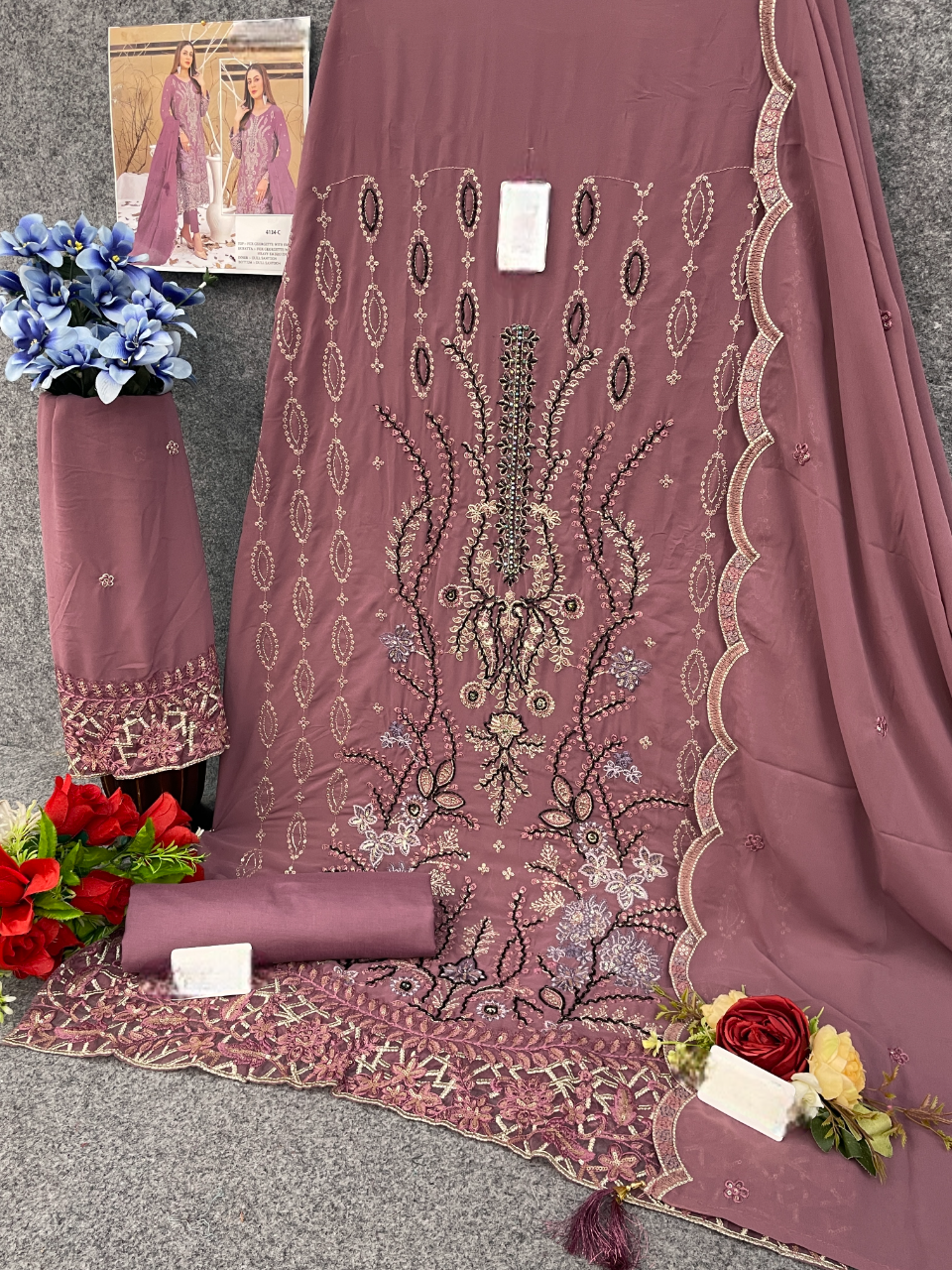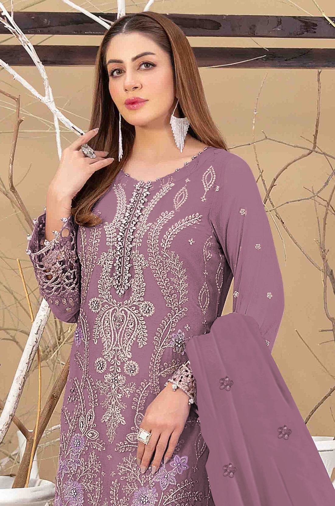 Dark peach Embroidered Faux Georgette Semi Stitched Salwar Suit