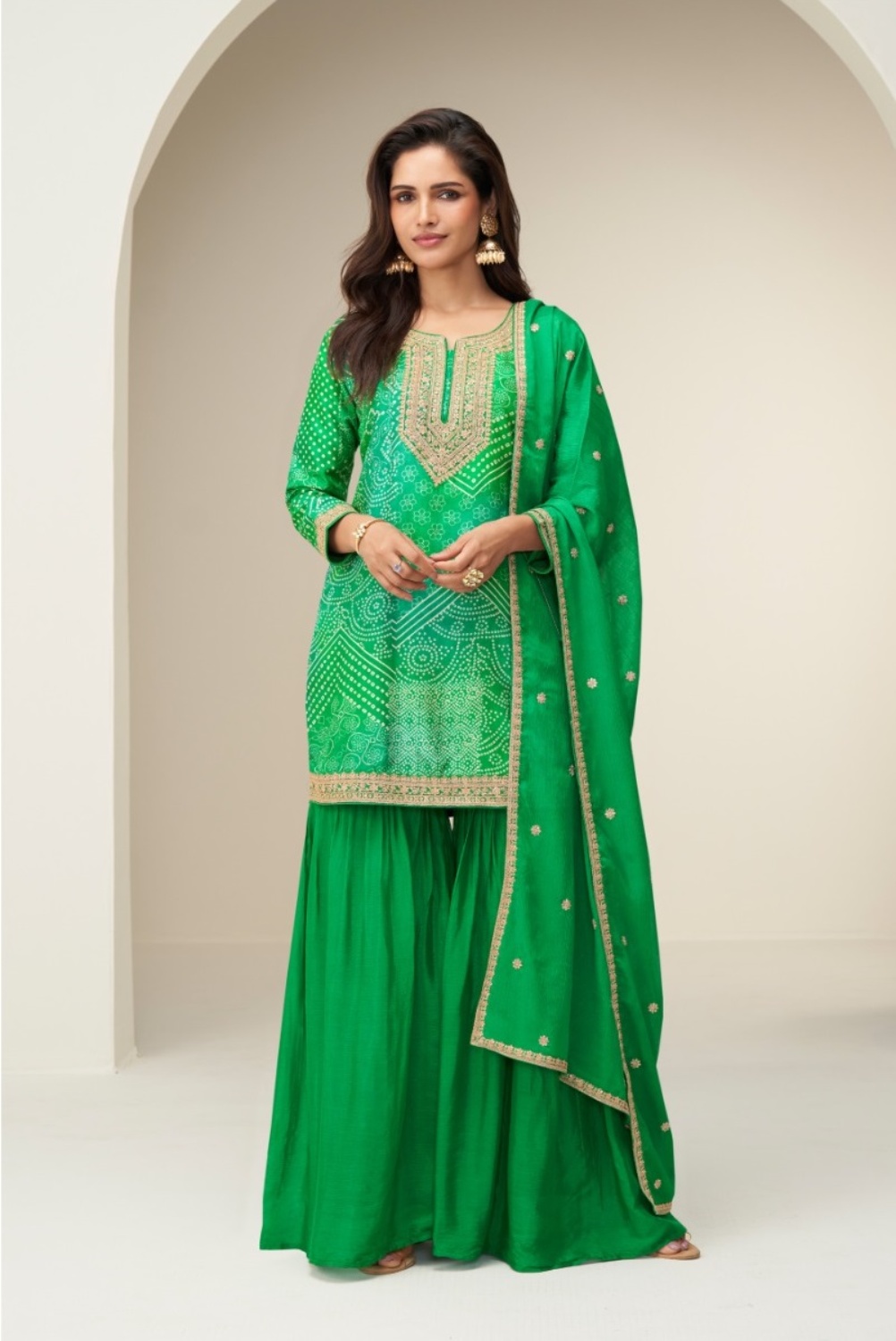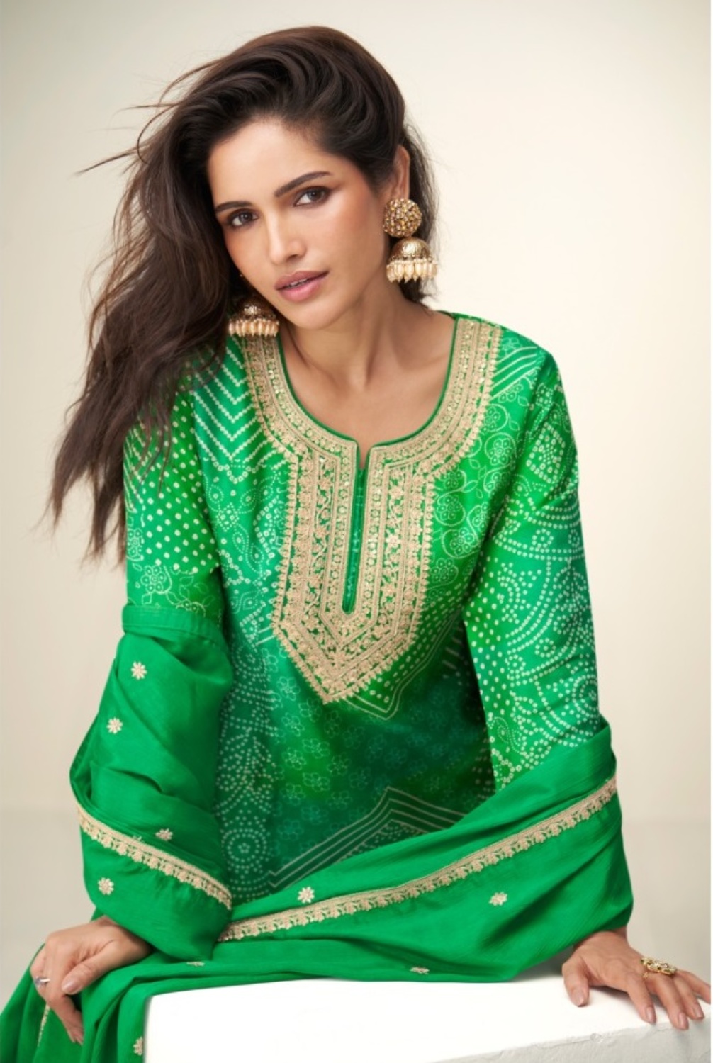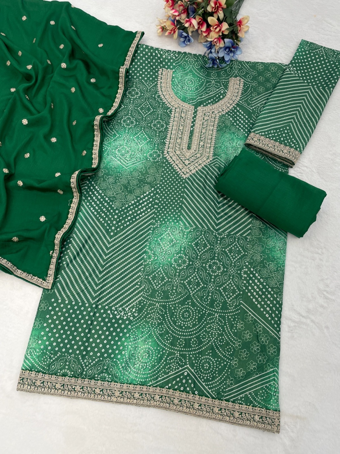 Green Chinon Semi Stitched Suit with Digital Print & Embroidery Codding Sequence Work