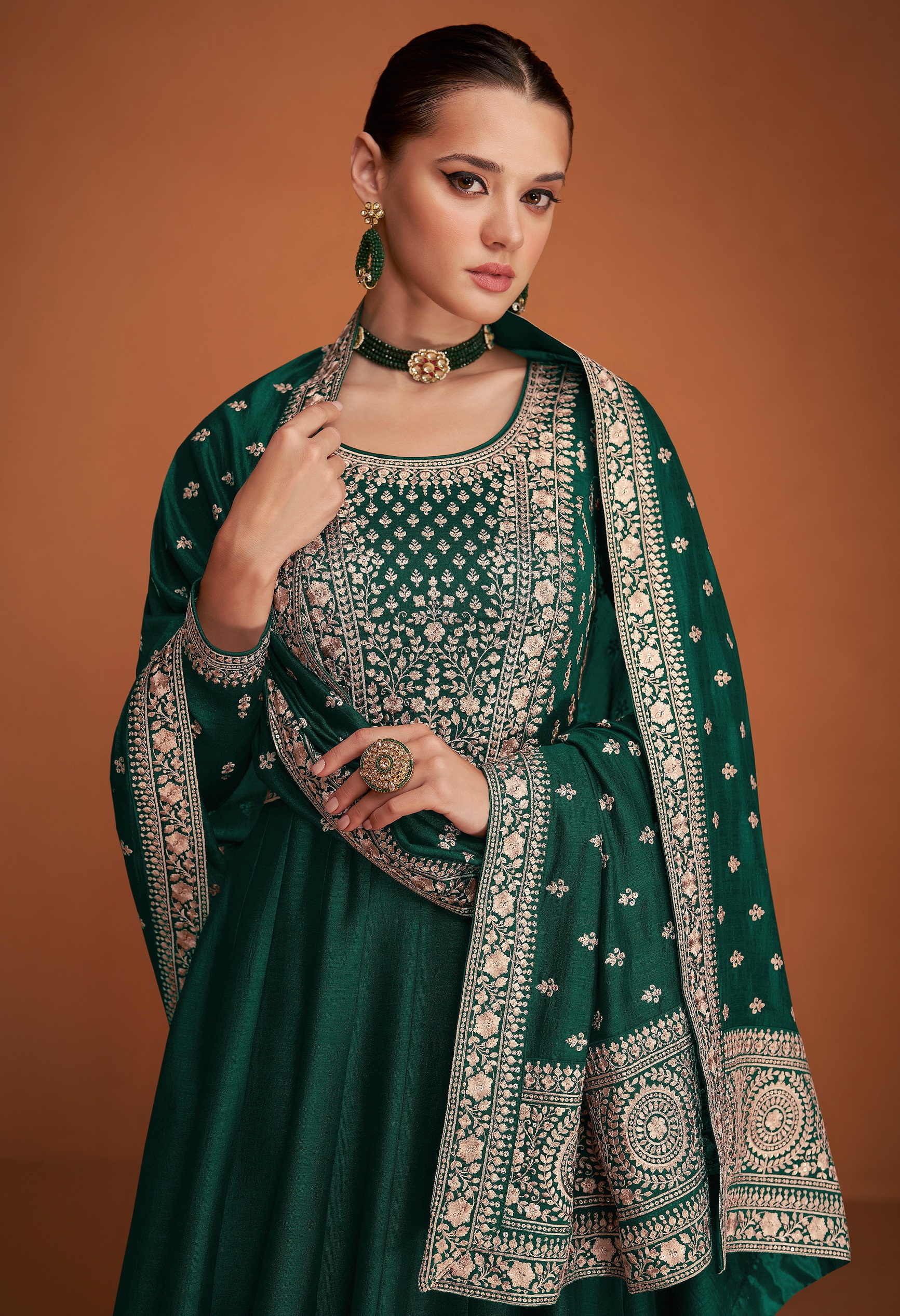 Green Designer Embroidered Heavy Premium Silk Semi Stitched Anarkali Suit