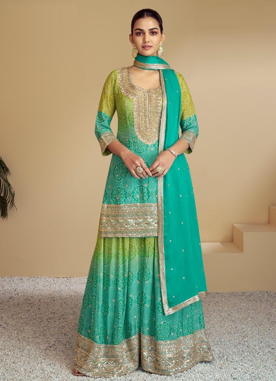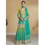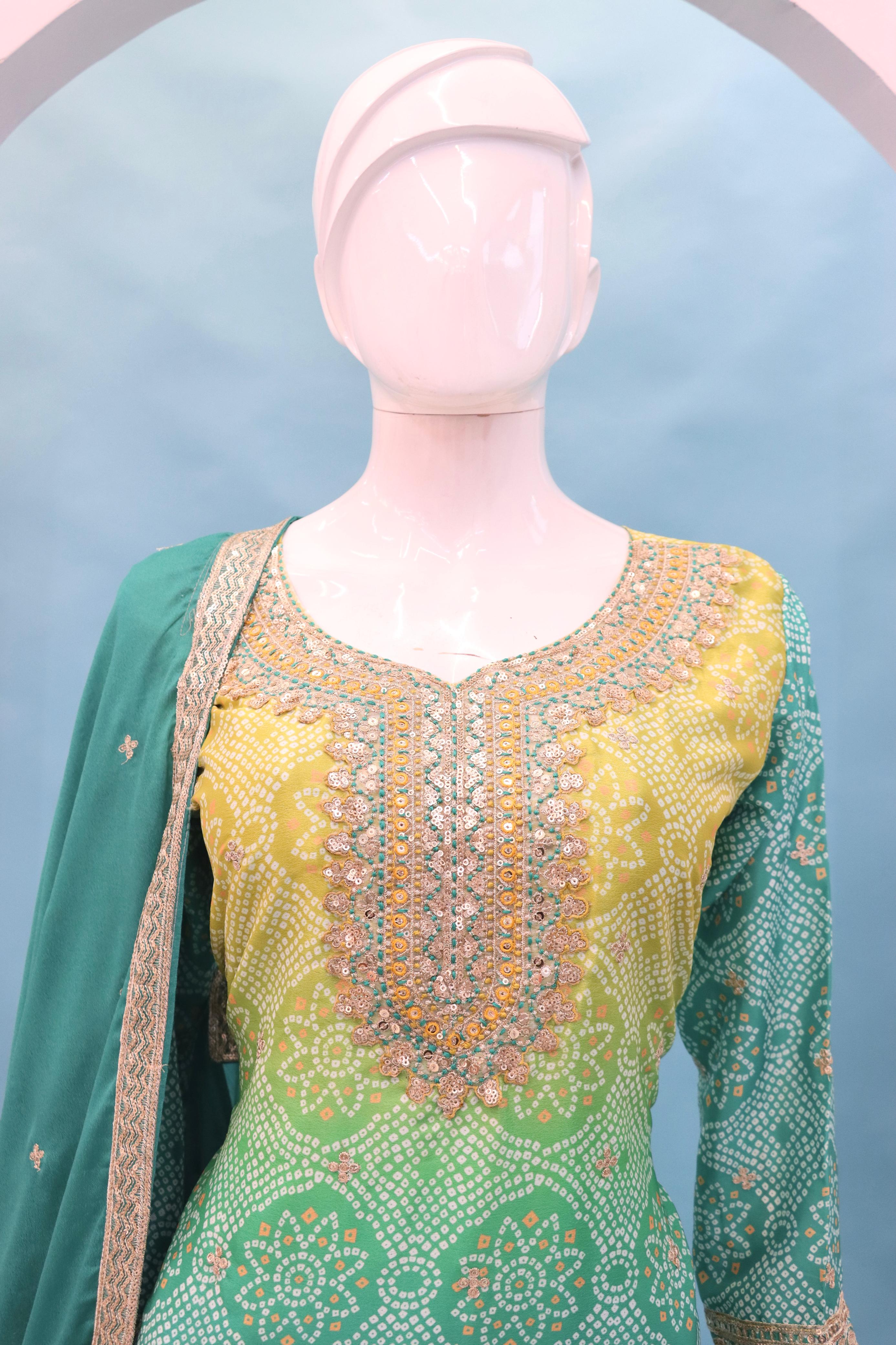 Green Digital print with Embroderied Silk Stitched Plazo Suit(Free Size)