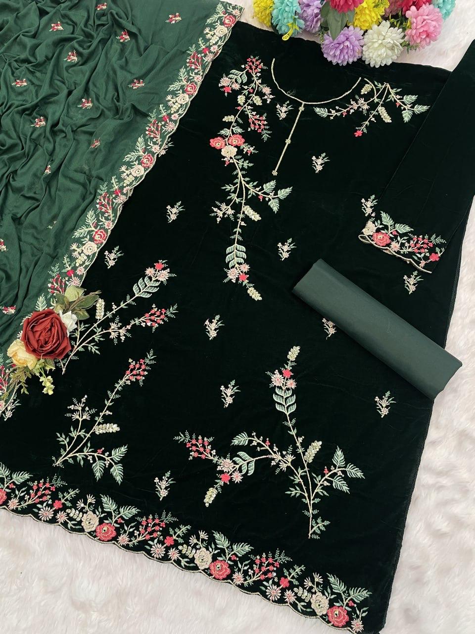 Green Pure Velvet Semi Stitched Suit with Heavy Embroidery Sequence Work