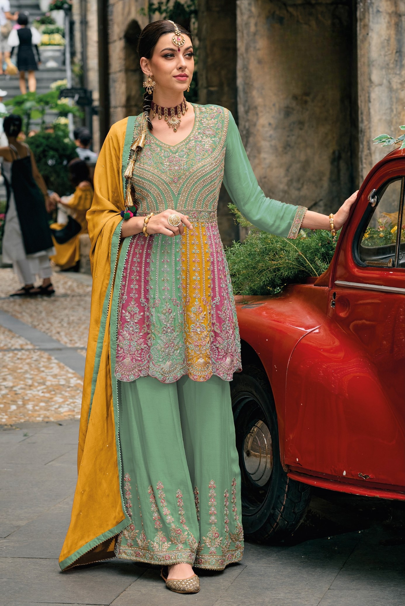 Green Real Gerogette Sequence Embroidered Readymade Salwar Suit (Free Size)