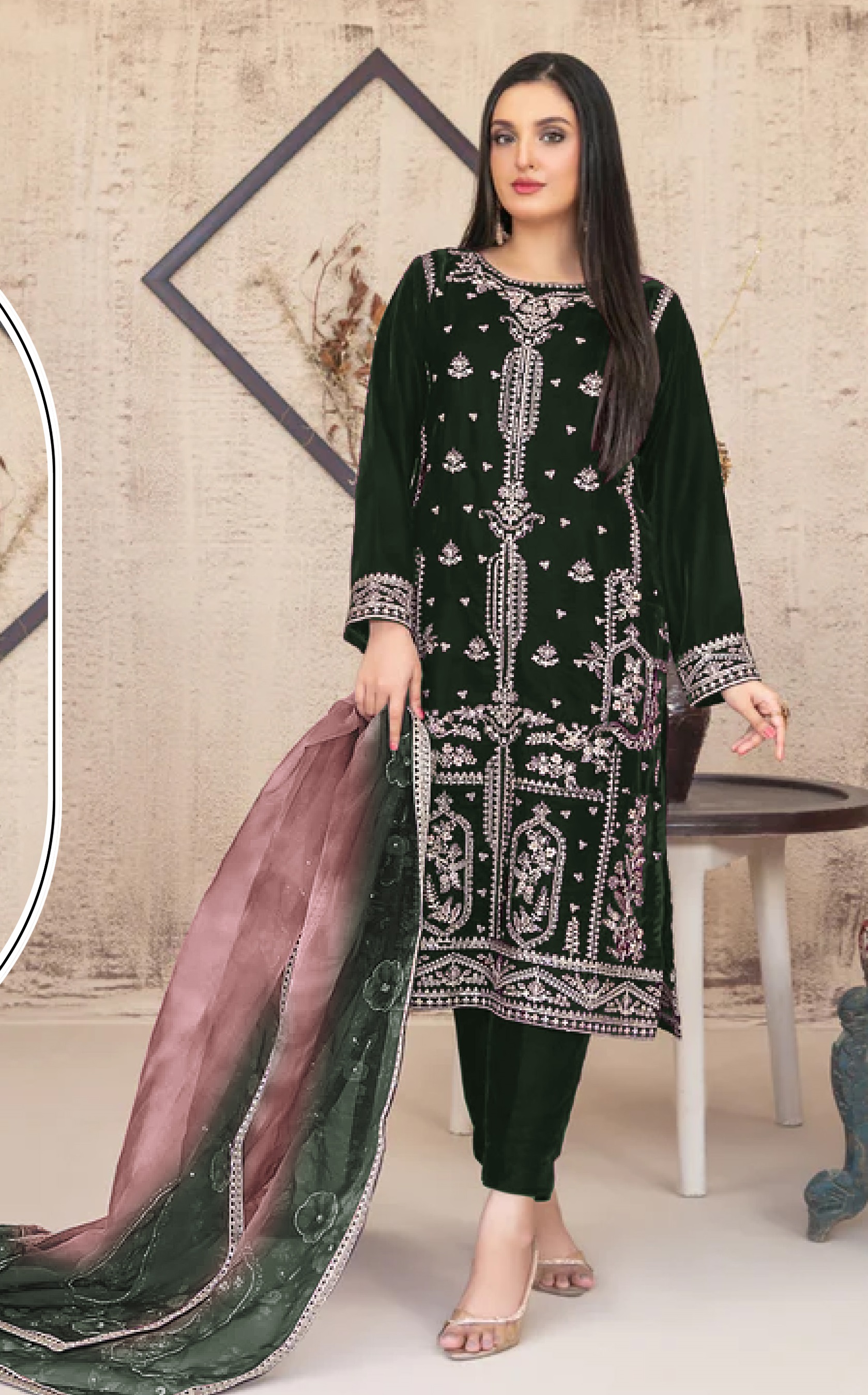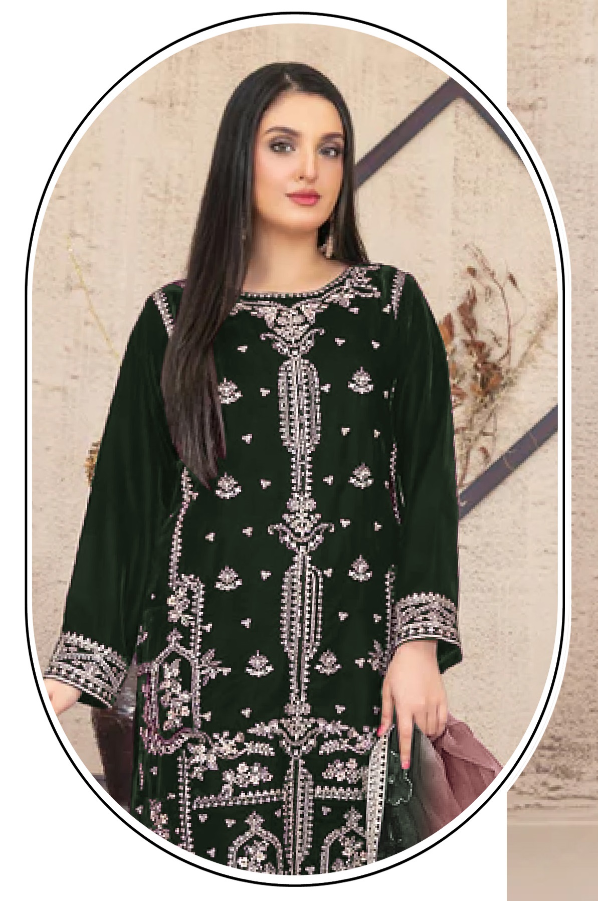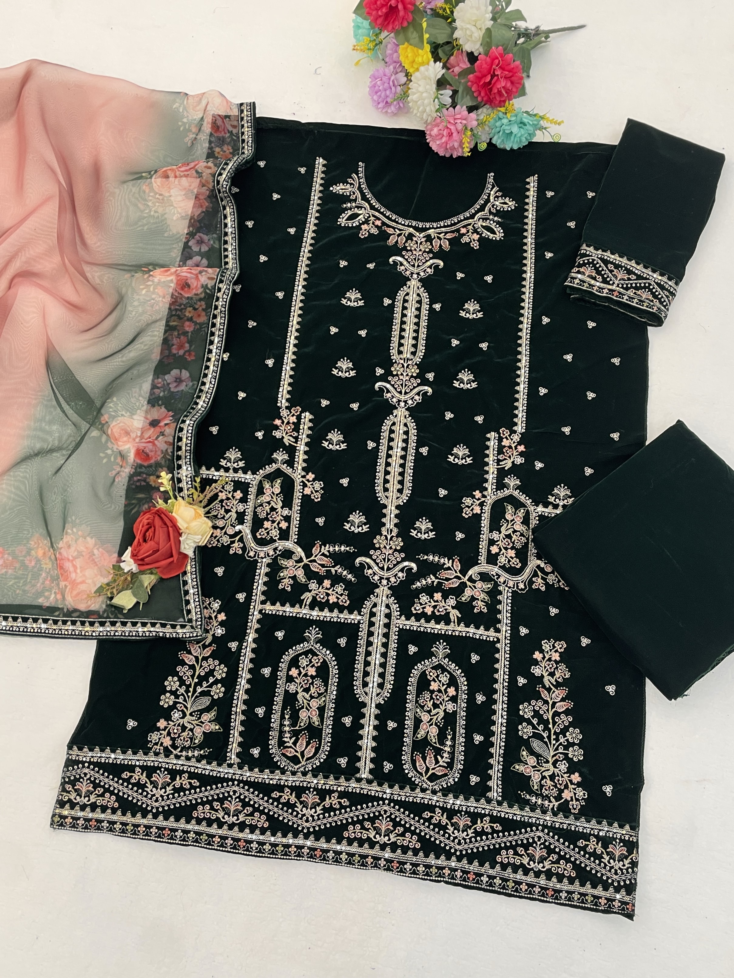 Green Velvet Semi Stitched Suit with Embroidery Sequence Work
