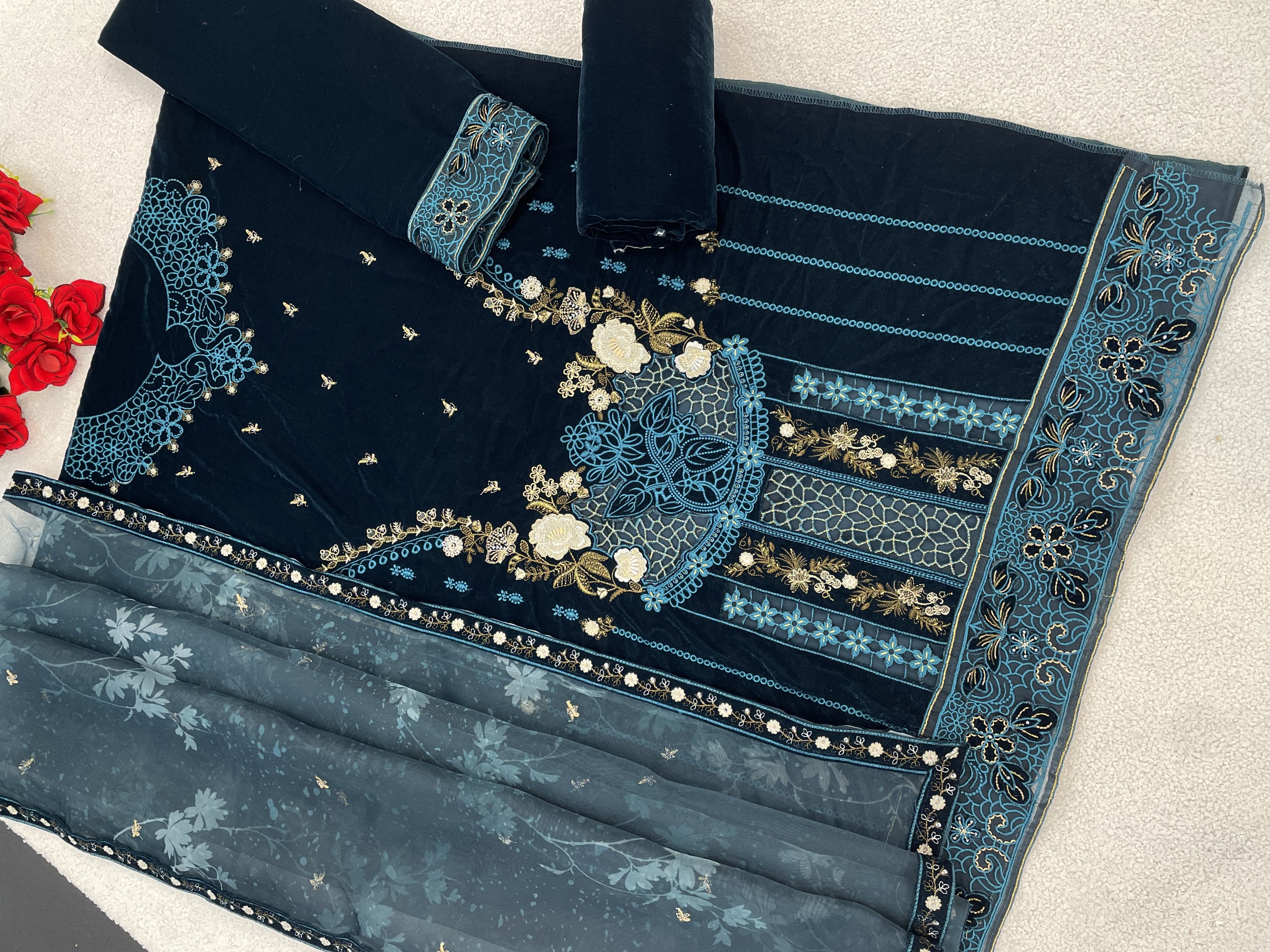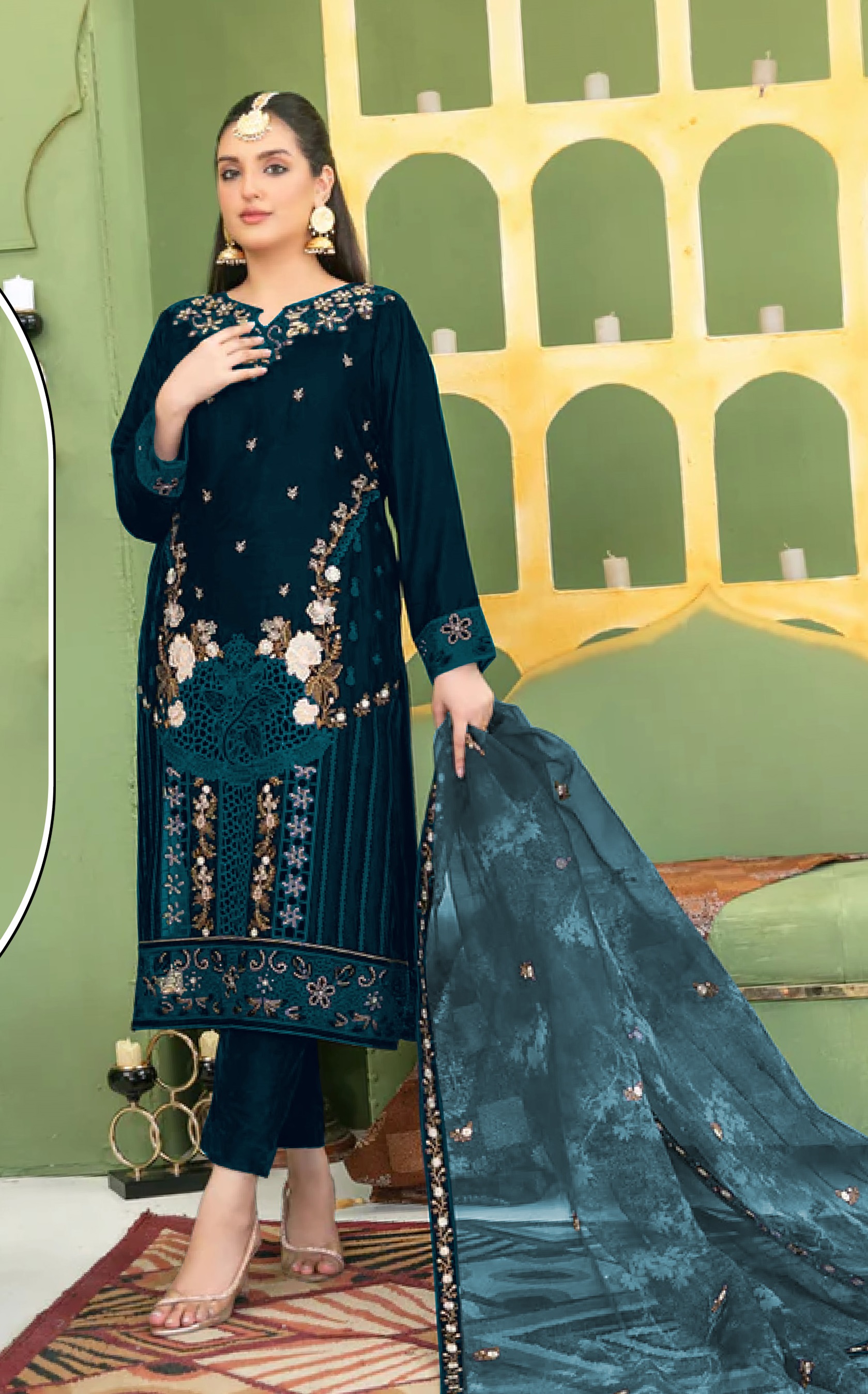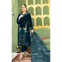 Green Velvet Semi Stitched Suit with Embroidery Sequence Work