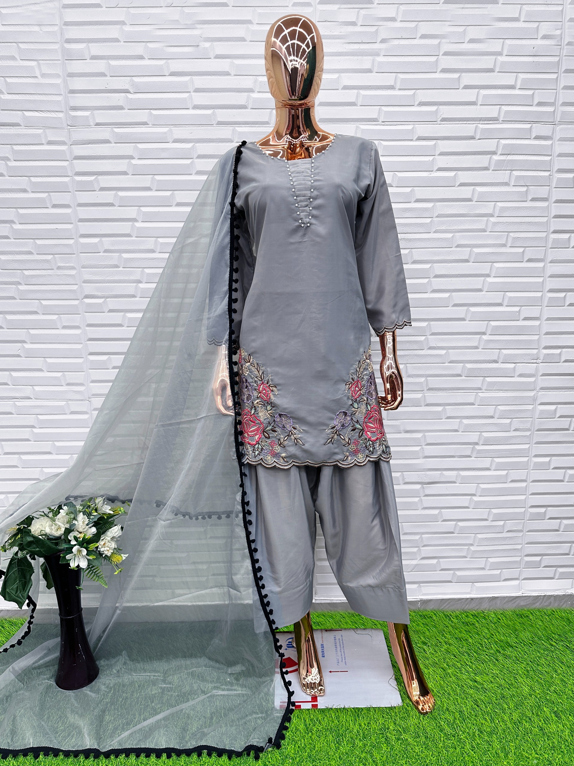 Grey Crape Readymade Salwar Suit with Embroidery & Sequence Work