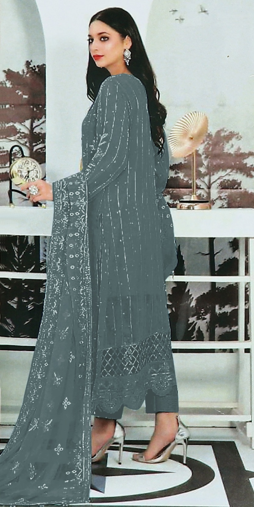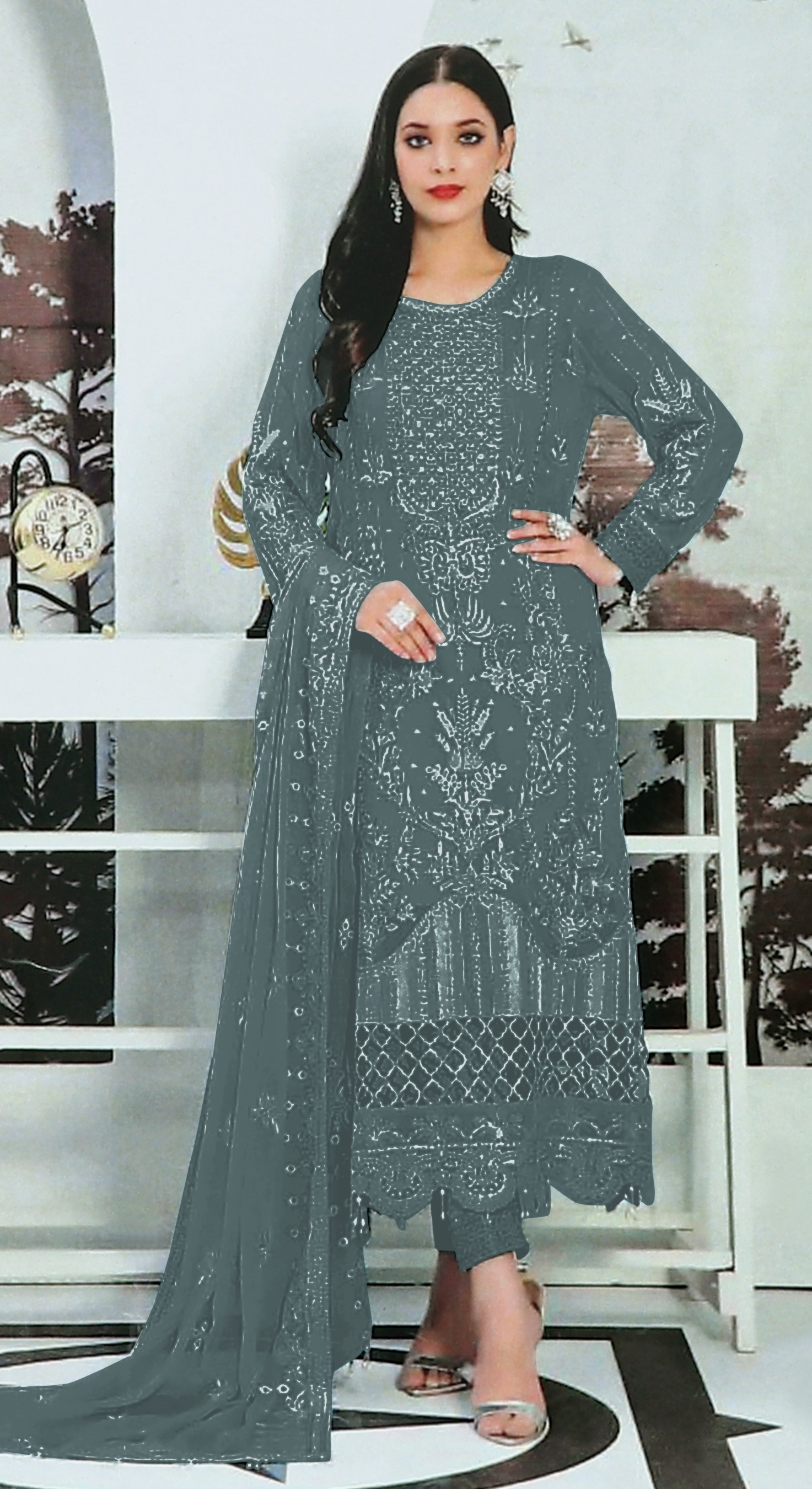 Grey Embroidered Faux Georgette Semi Stitched Salwar Suit