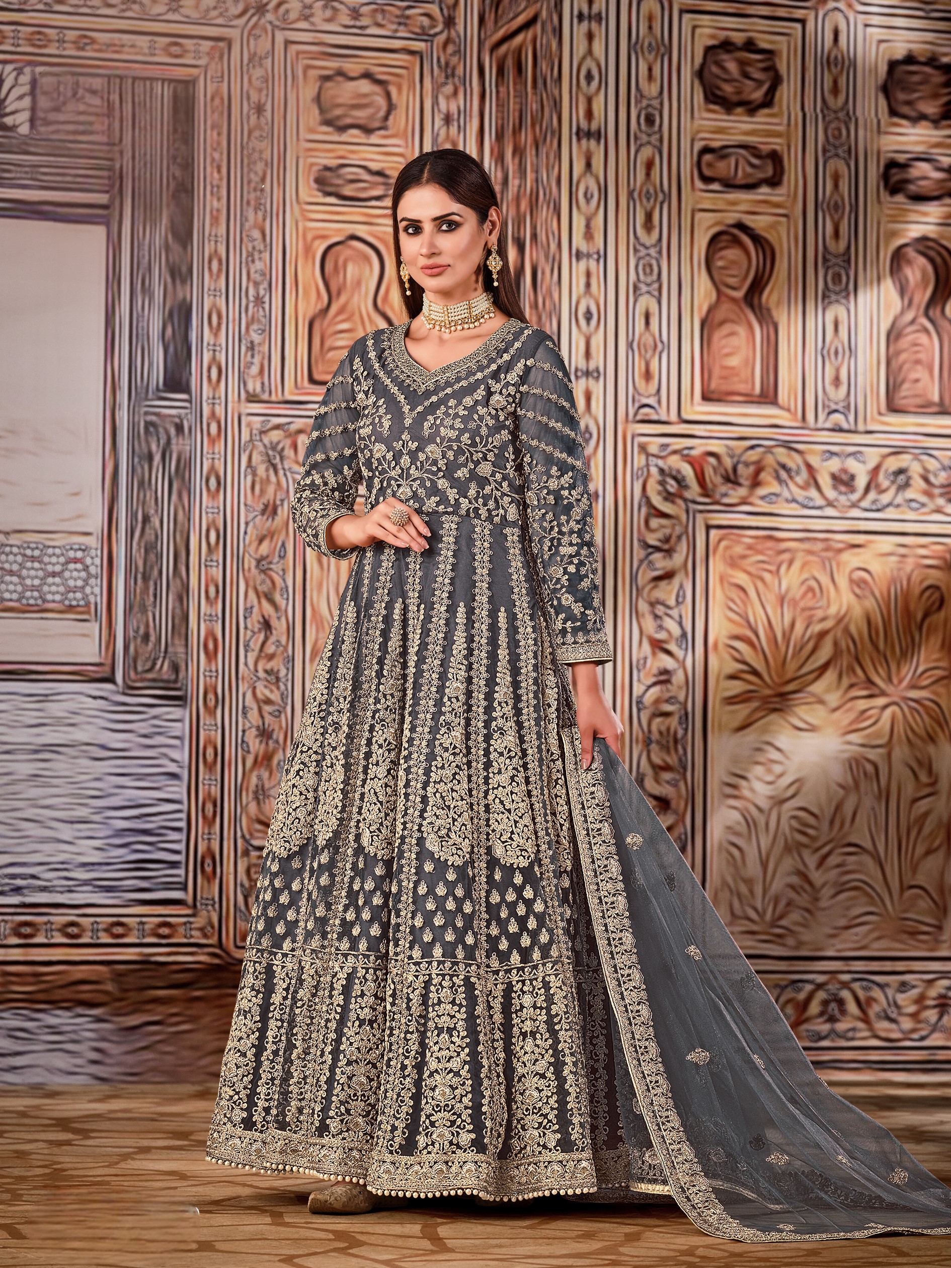 Grey Embroidered Net Semi Stitched Anarkali Suit