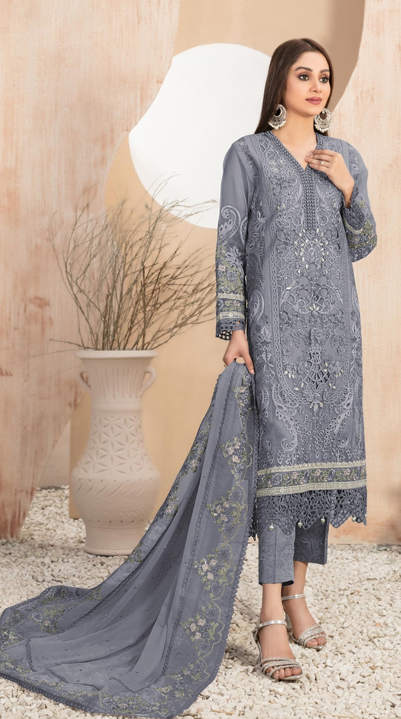 Grey Faux Georgette Semi Stitched Suit with Embroidery Work