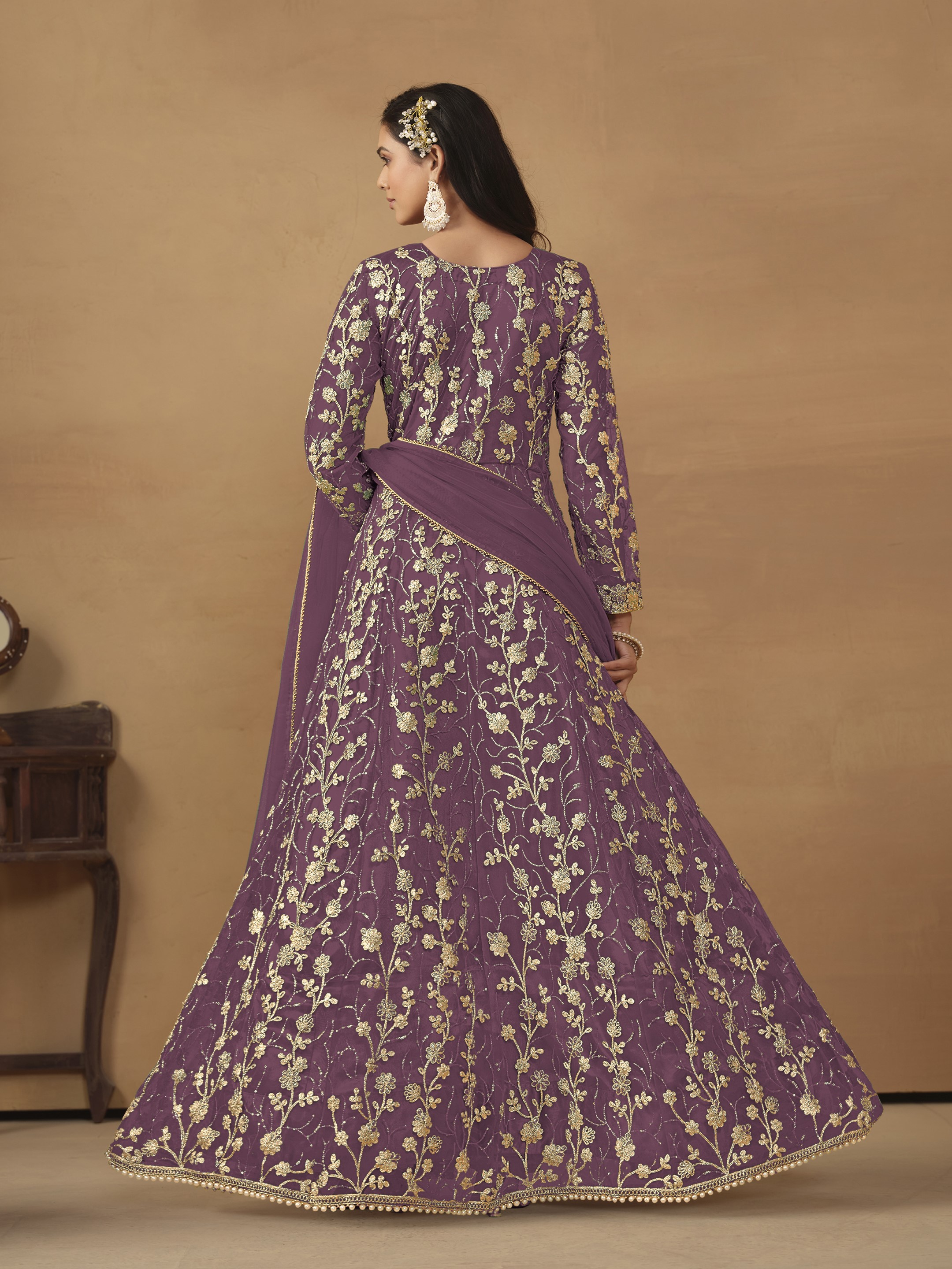 Lavender Embroidered Butterfly Net Semi Stitched Anarkali Suit