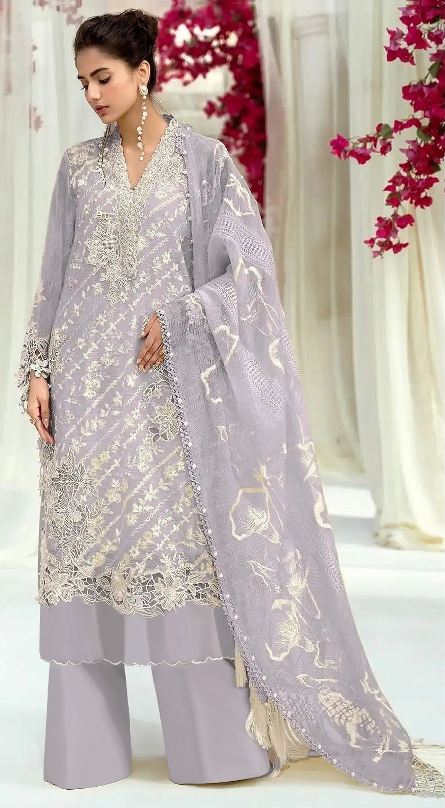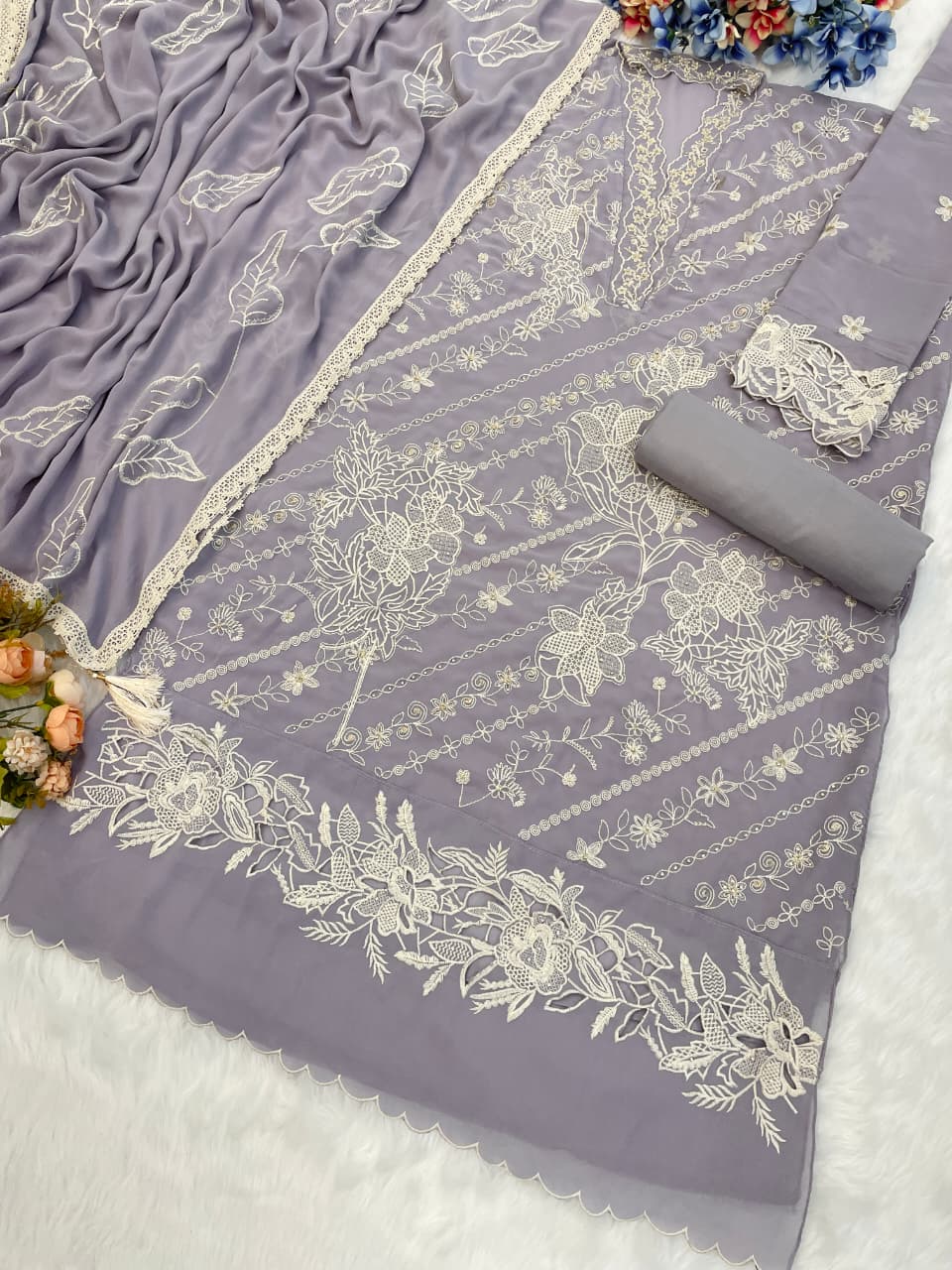 Lavender embroidered sequence work heavy fox georgette unstitched suit with zarkan