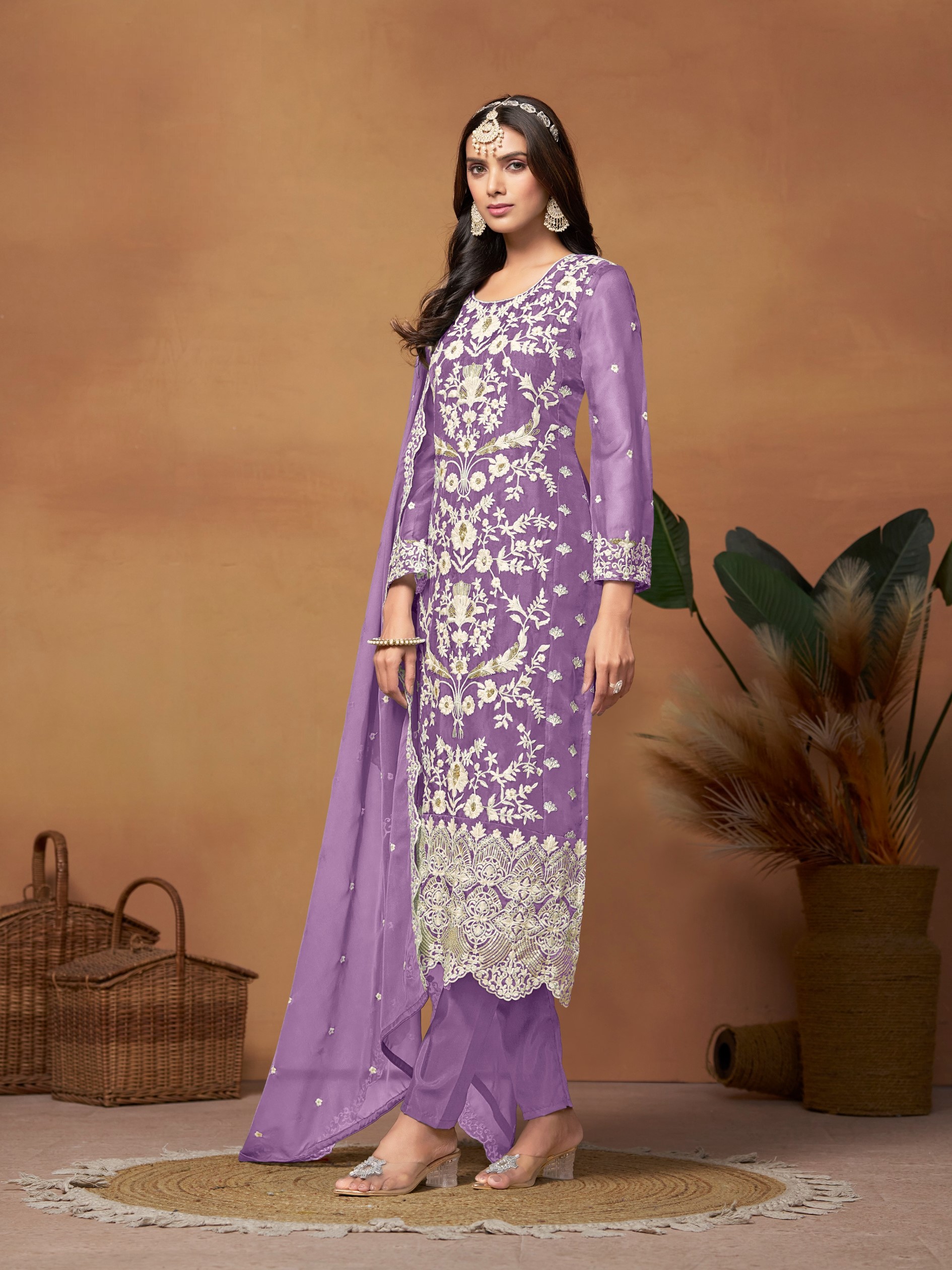 Lavender Embroidered Soft Organza Semi Stitched Salwar Suit