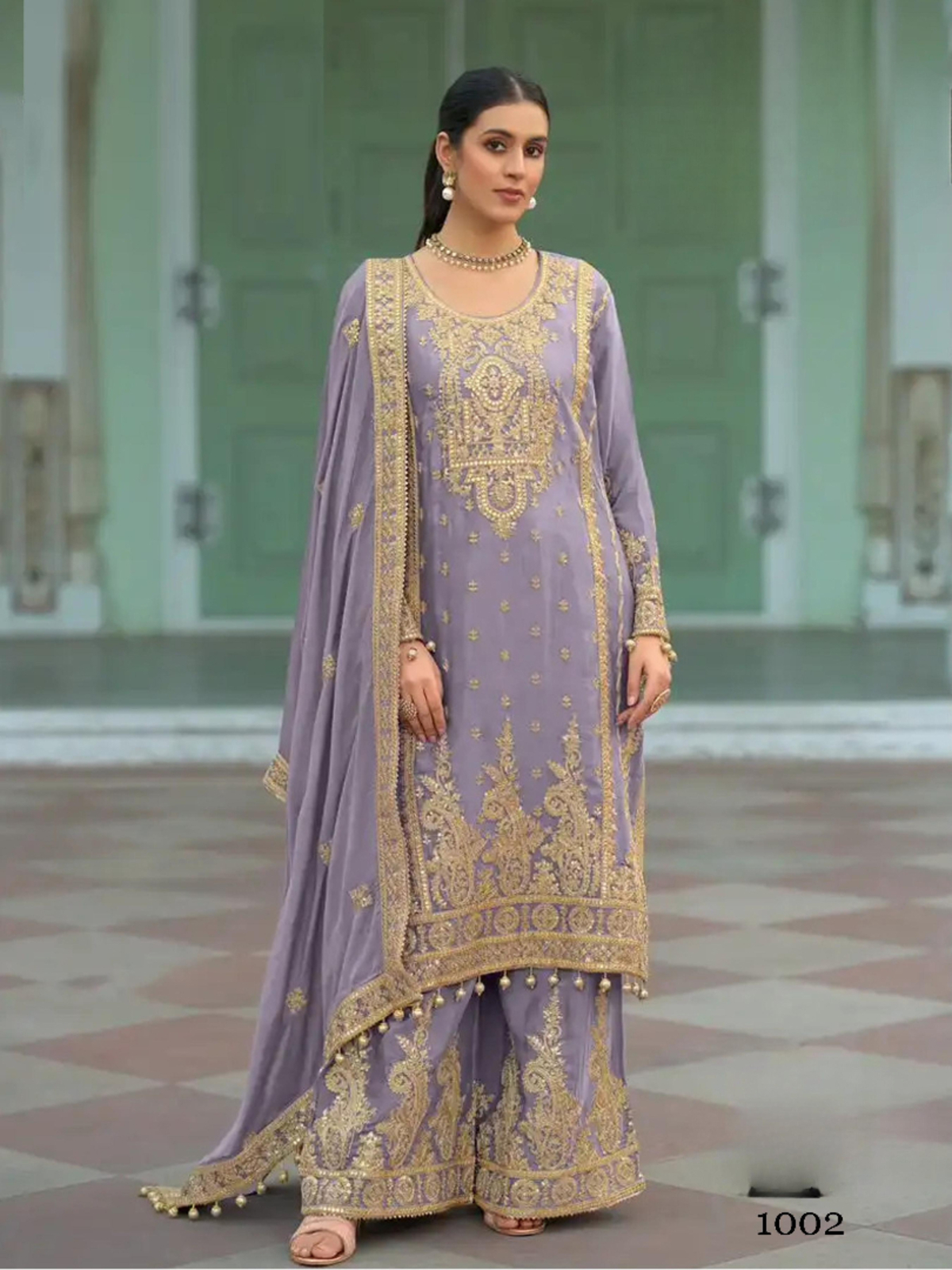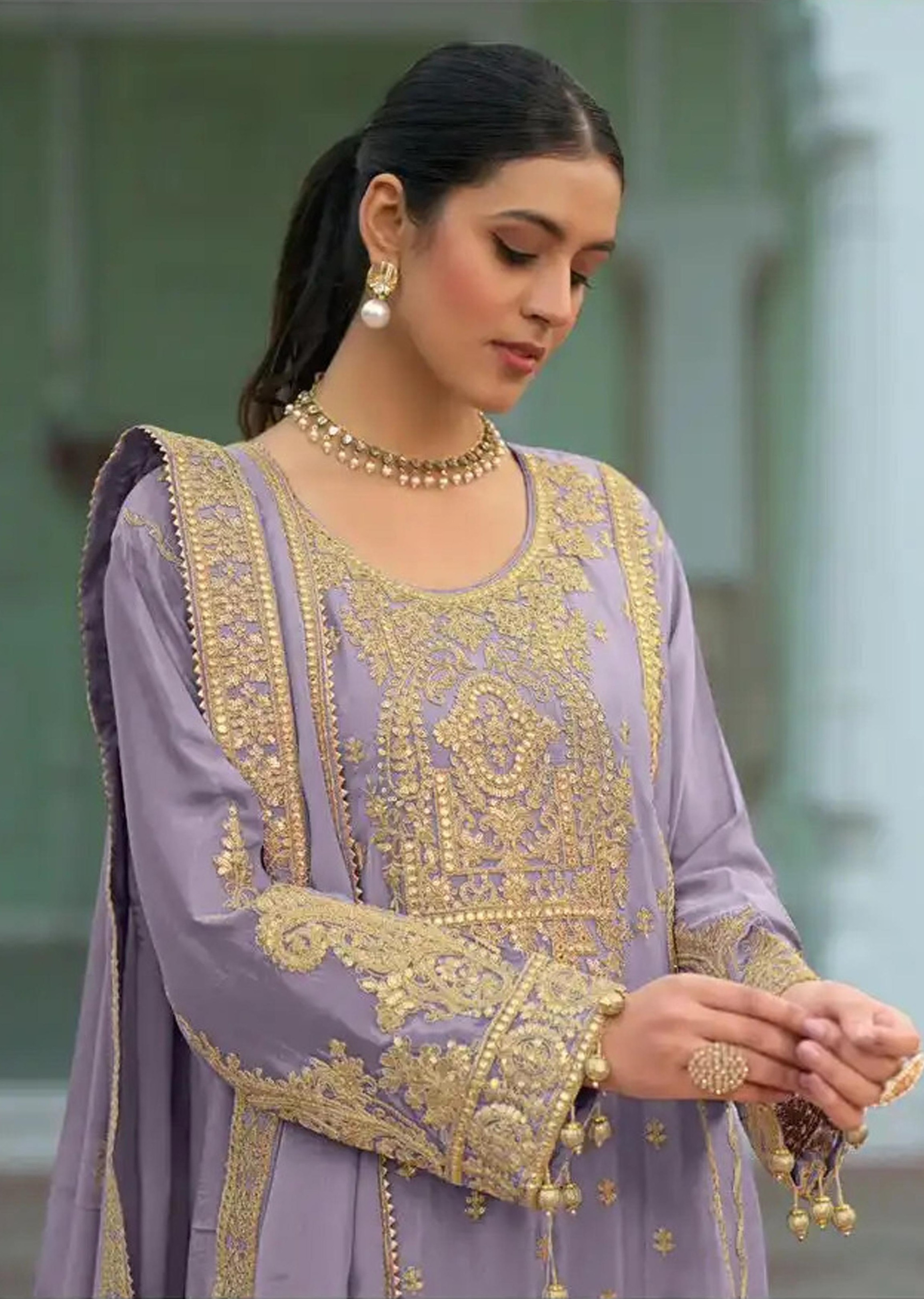 Lavender Heavy Chinon Readymade Plazzo Suit with Heavy Embroidery Work