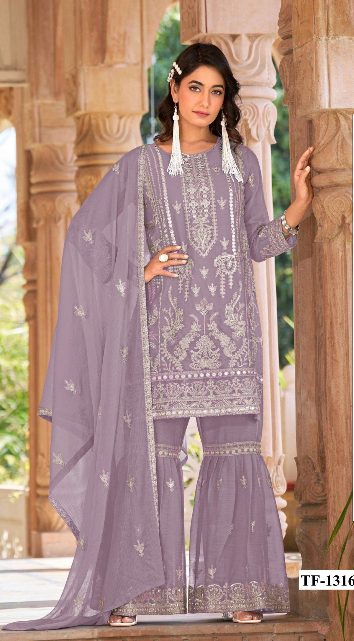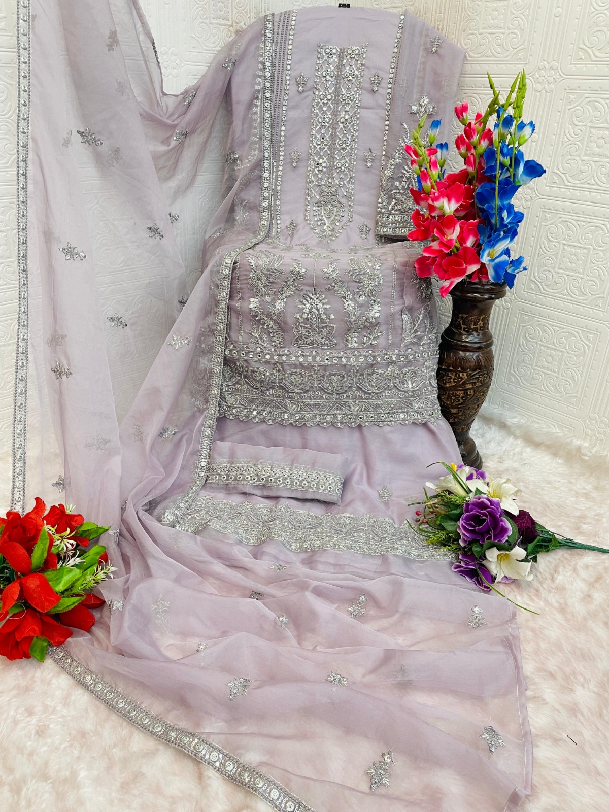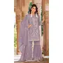 Lavender Naylon Organza Semi Stitched Suit With Embroidery & Mirror Work