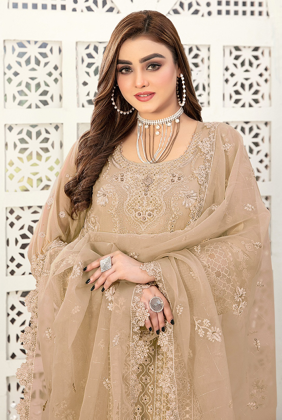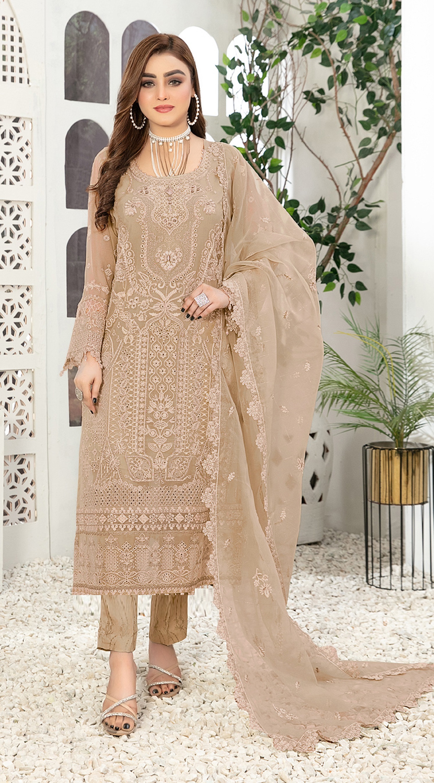 Light Brown Embroidered Faux Georgette Semi Stitched Salwar Suit