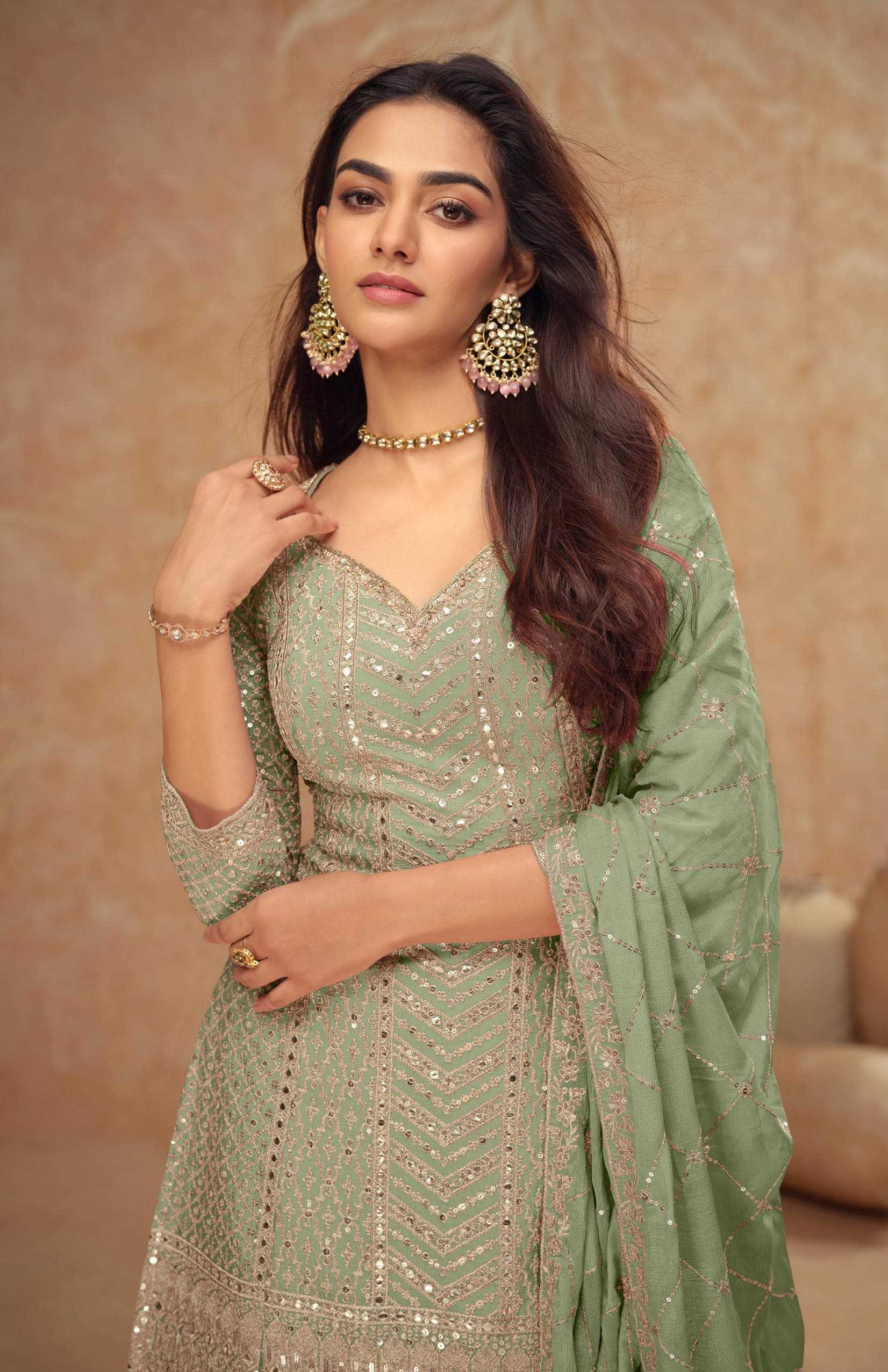 Light Green Chinon Sequence Embroidered Readymade Salwar Suit (Free Size)