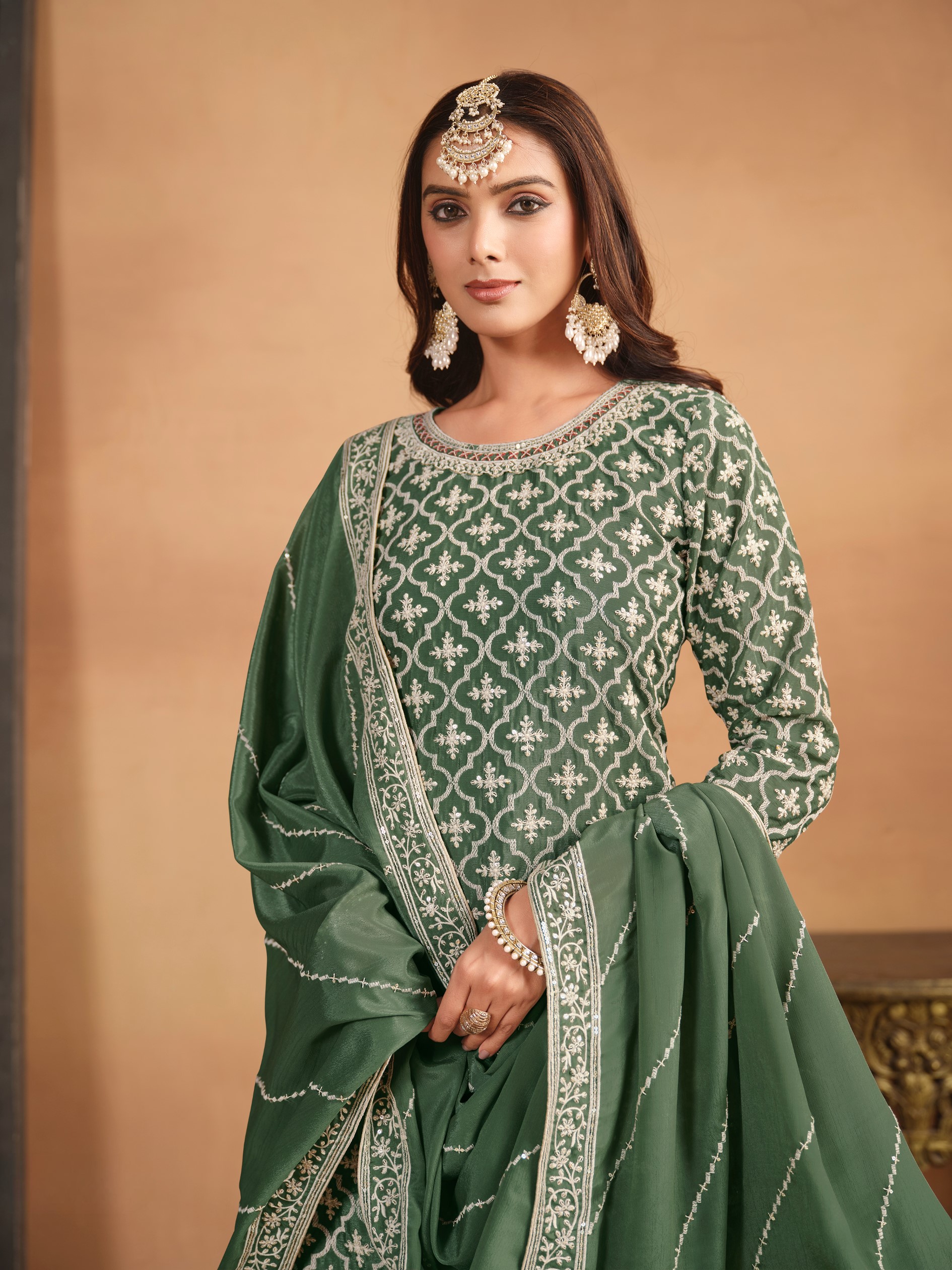Light Green Embroidered Chinon Silk Semi Stitched Salwar Suit