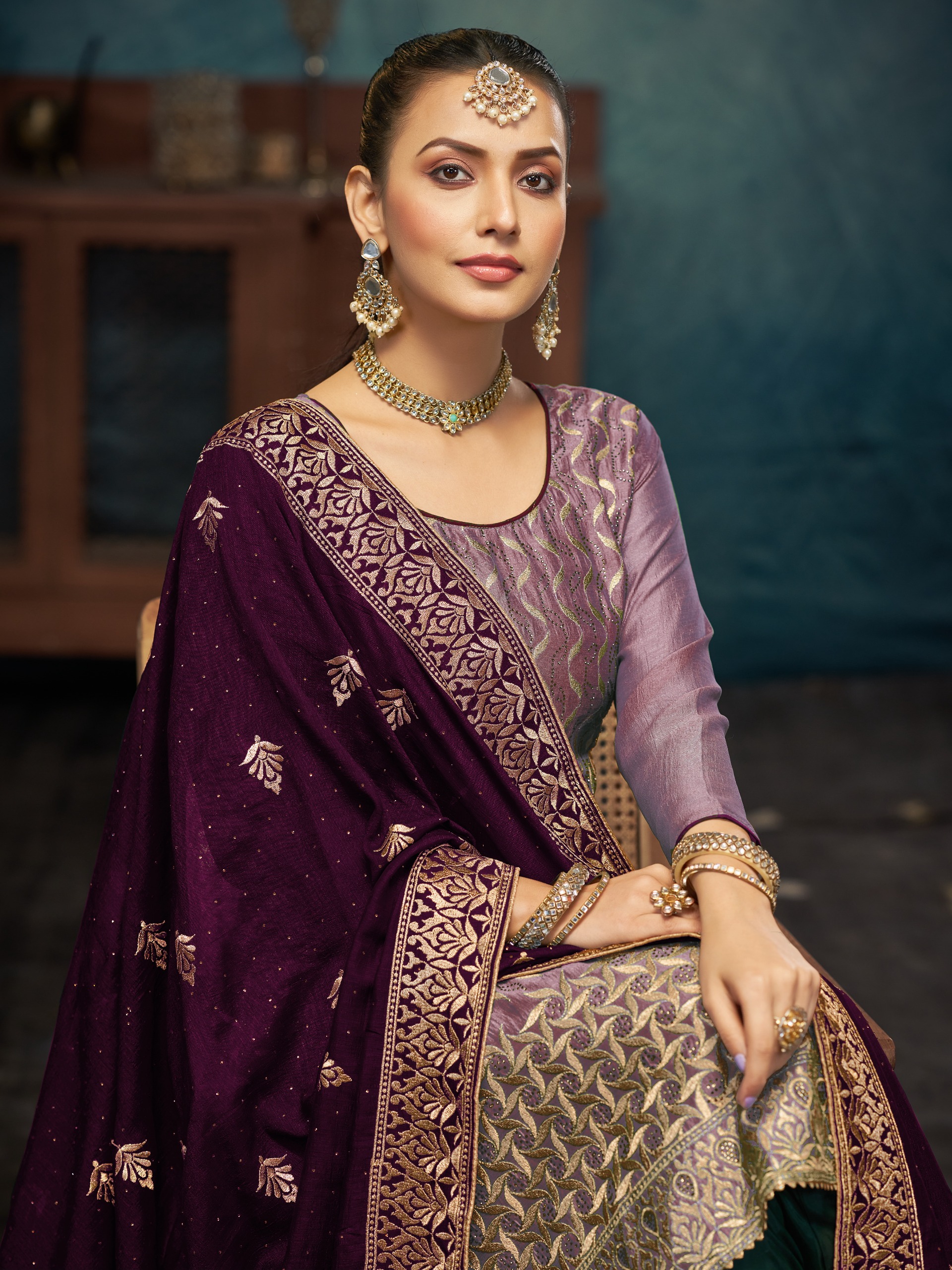 Light Purple Premium Embroidered with servoswaki daimond Vichitra Silk Semi Stitched Salwar Suit