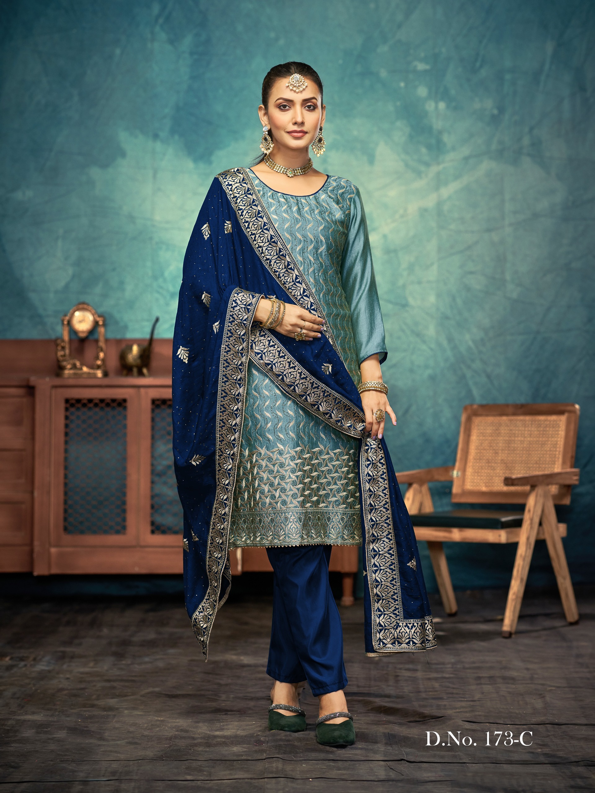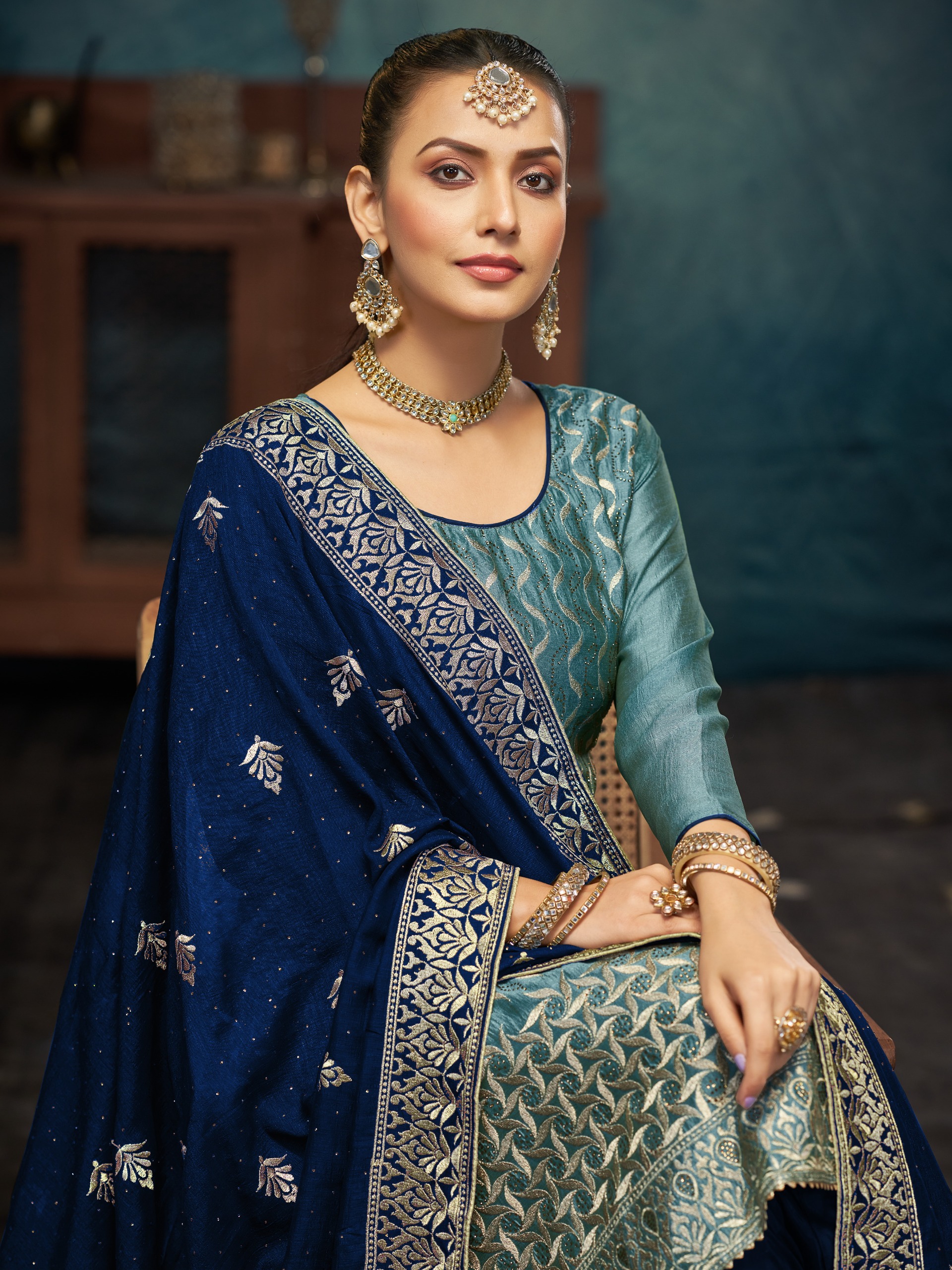 Light Teal Premium Embroidered with servoswaki daimond Vichitra Silk Semi Stitched Salwar Suit