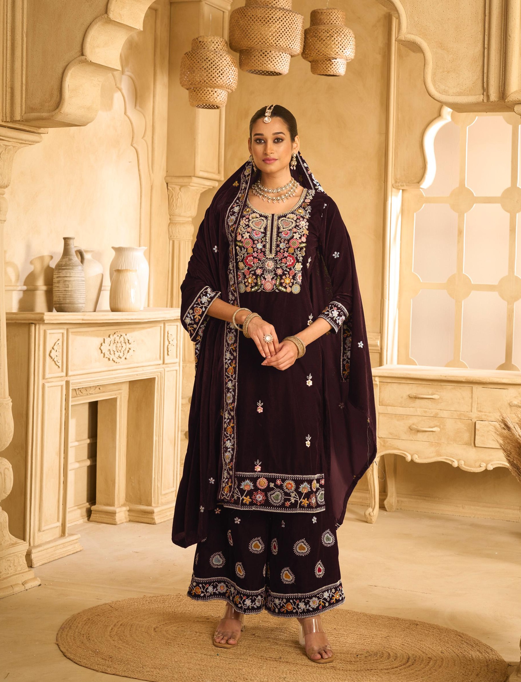 Maroon Embroderied Velvet Semi-Stitched Plazo Suit