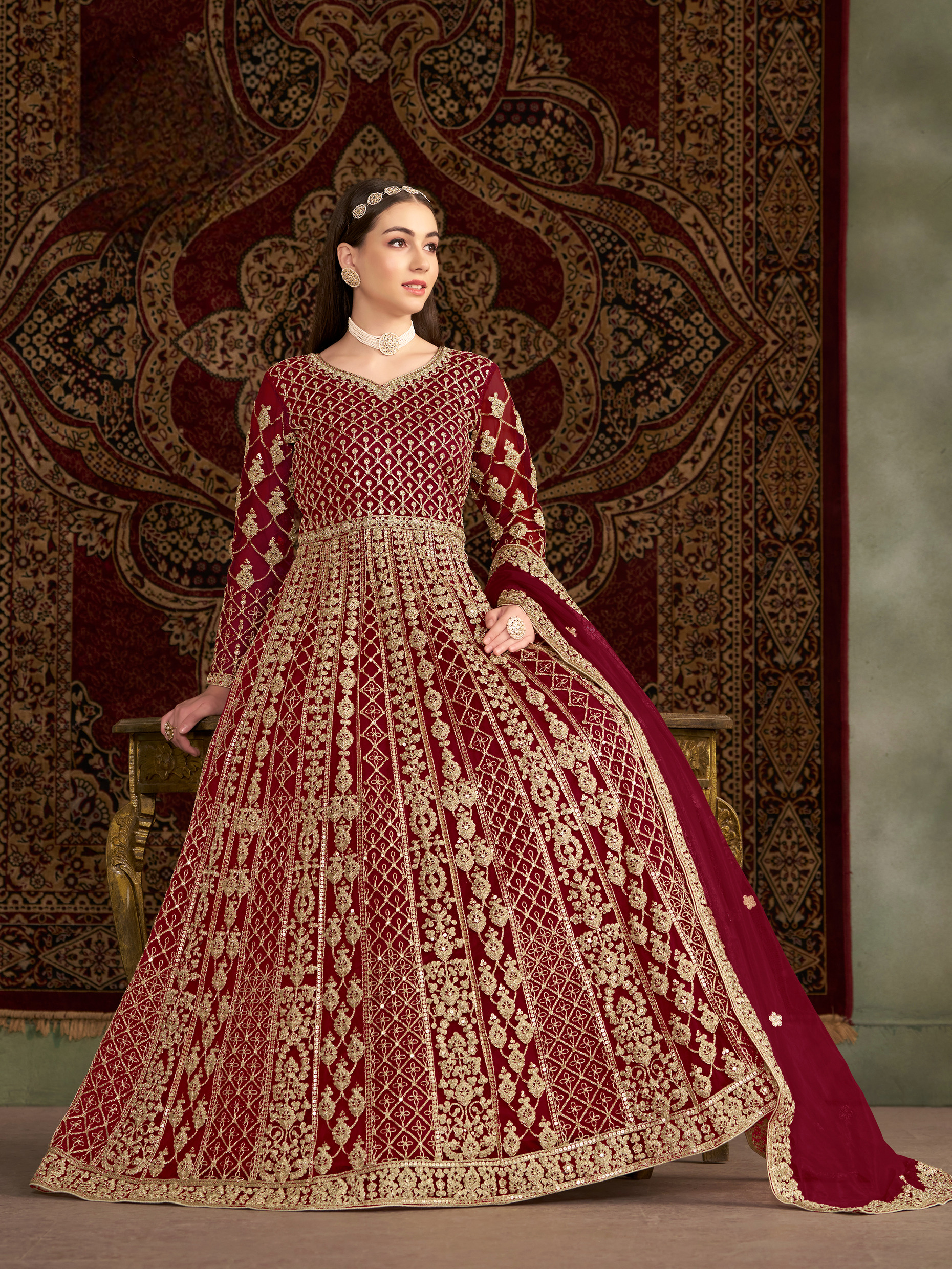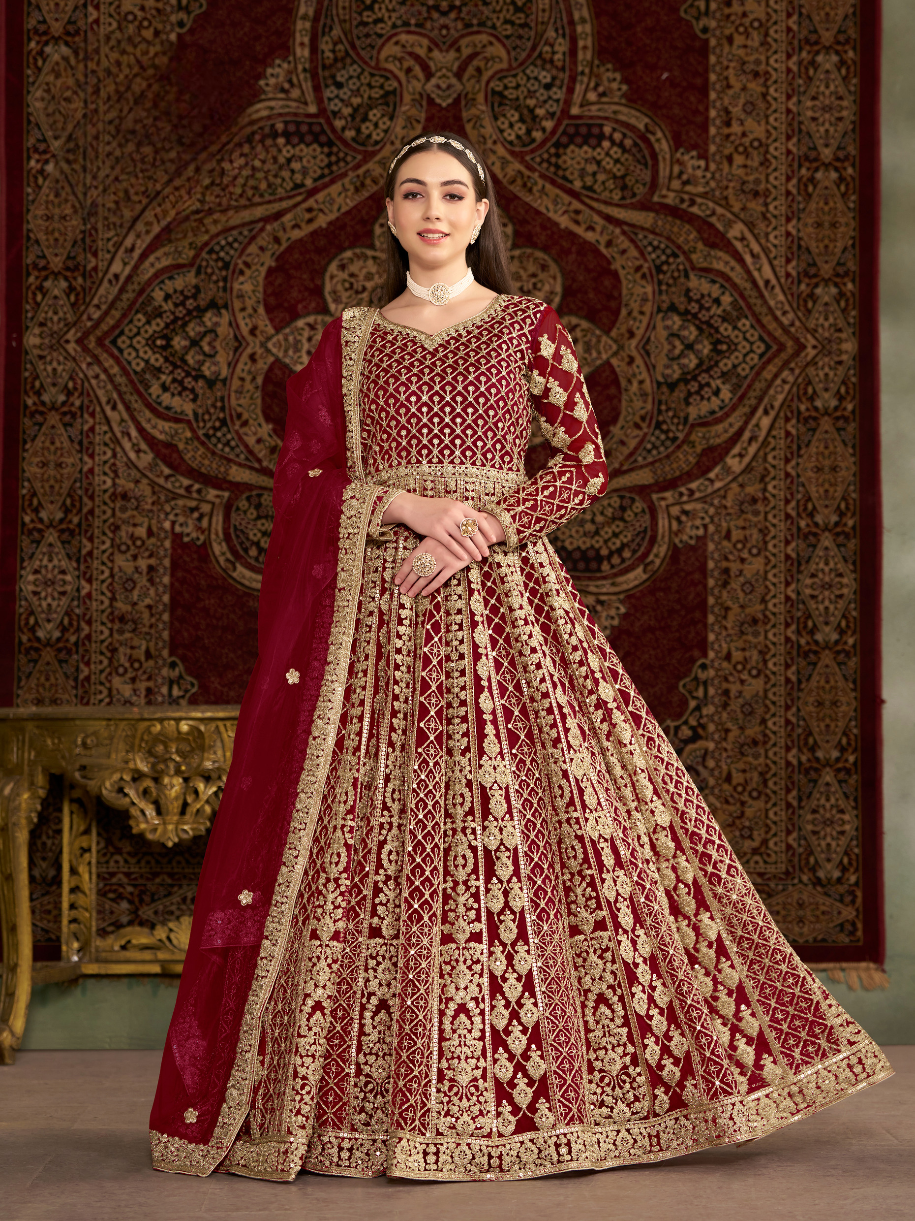 Maroon Embroidered Net Semi Stitched Anarkali Suit