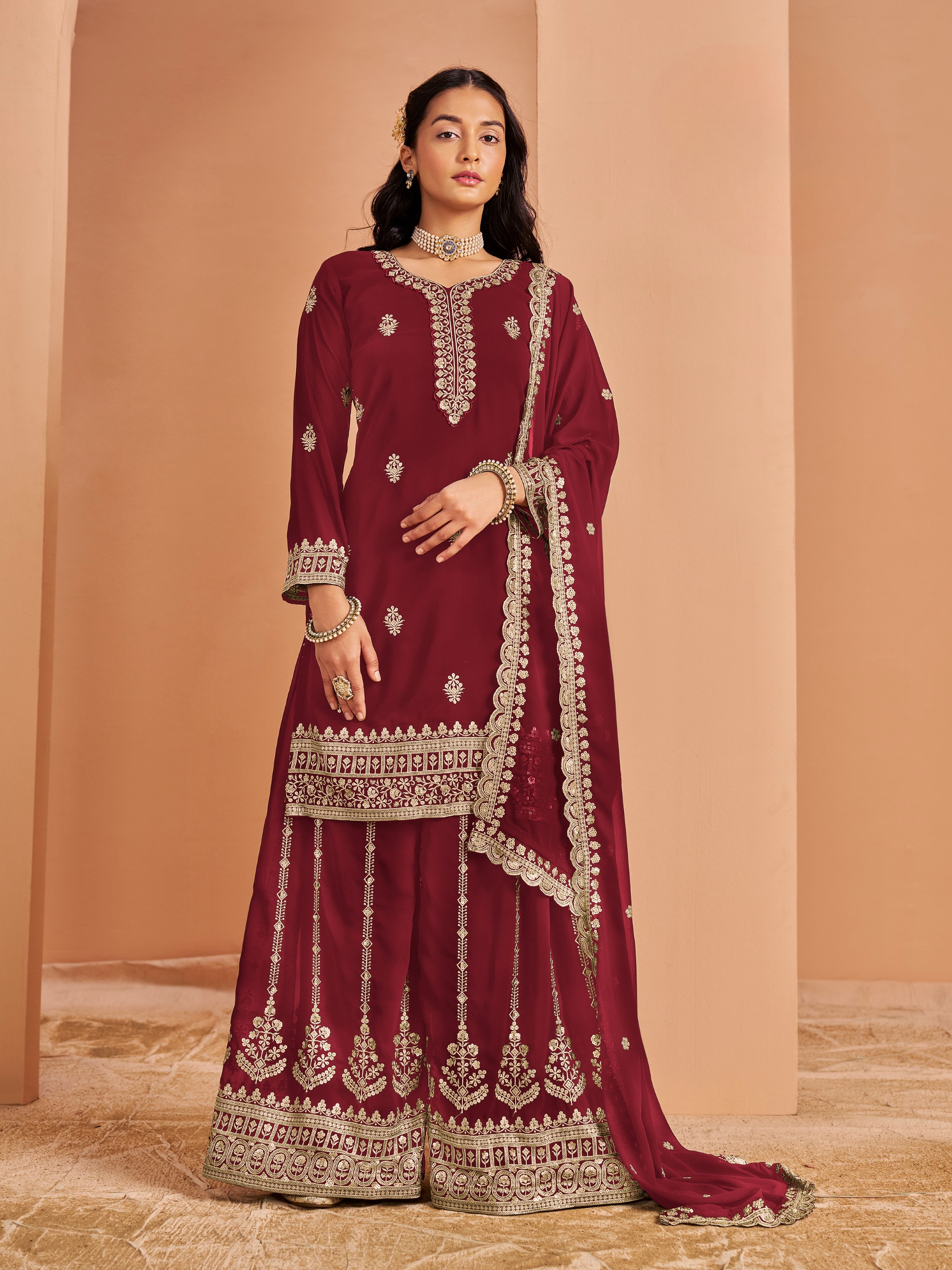 Maroon Premium Georgette Embroidered Semi Stitched Salwar Suit