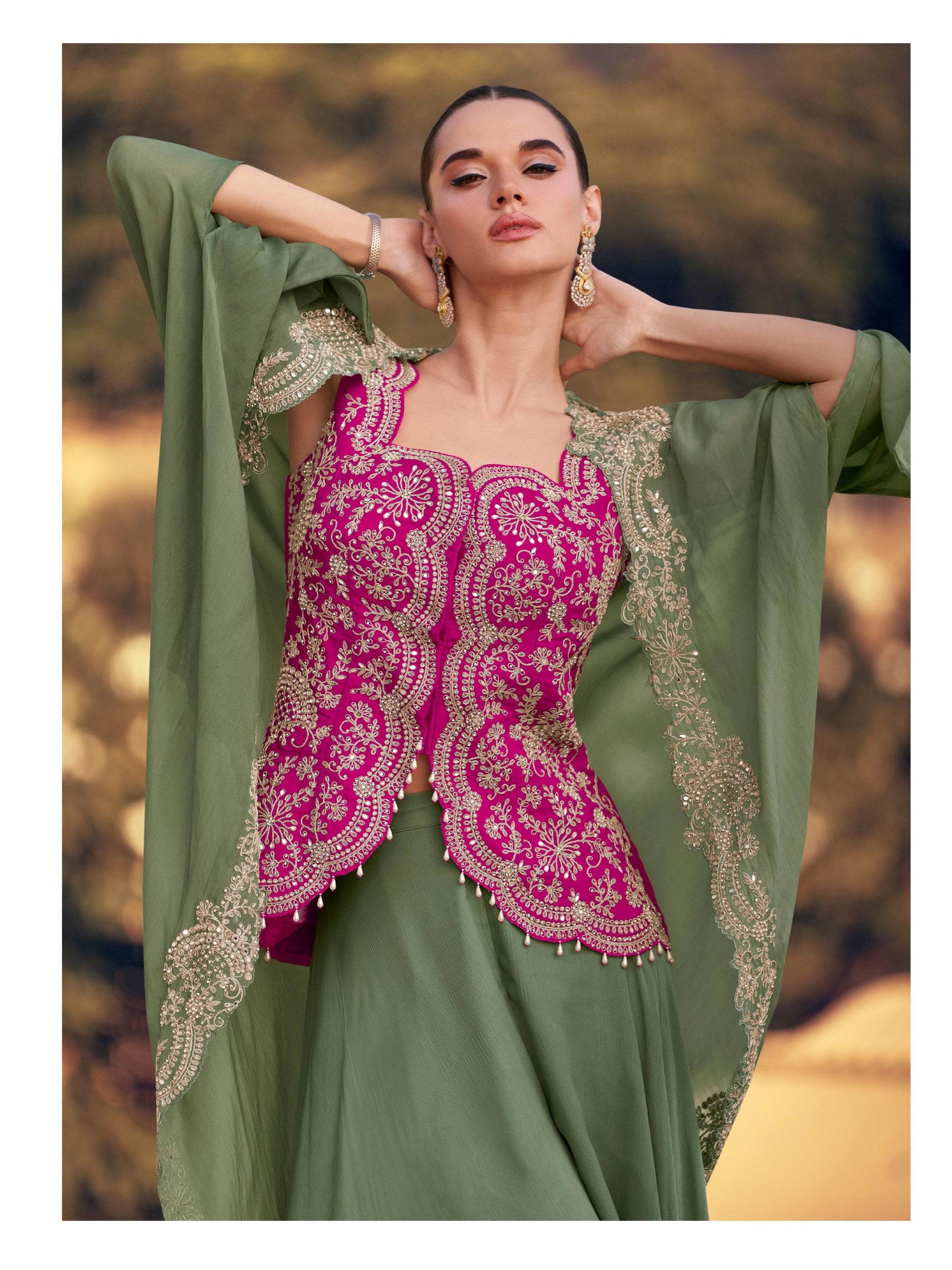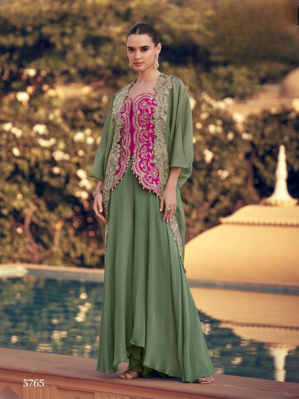 Mehendi Chinon Readymade Shrug Suit with Heavy Embroidery Work