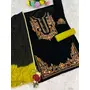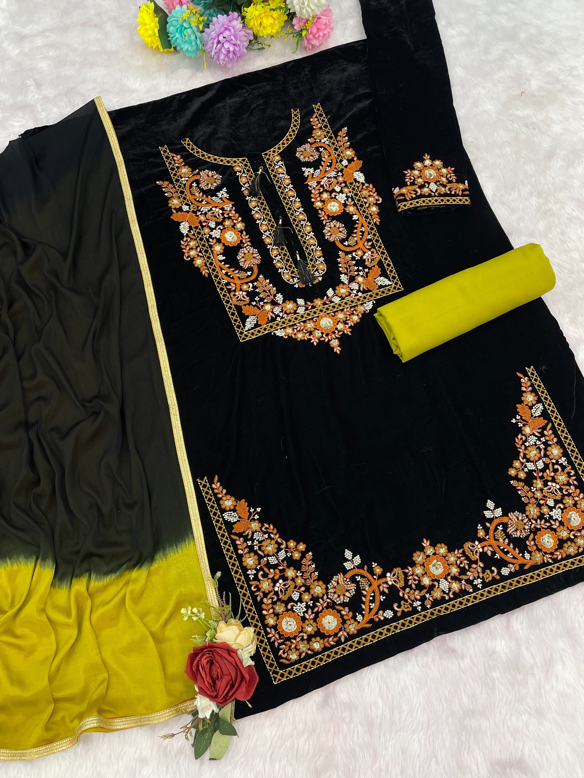 Mustard-black embroidery sequence & thread work velvet semi stitched salwar suit