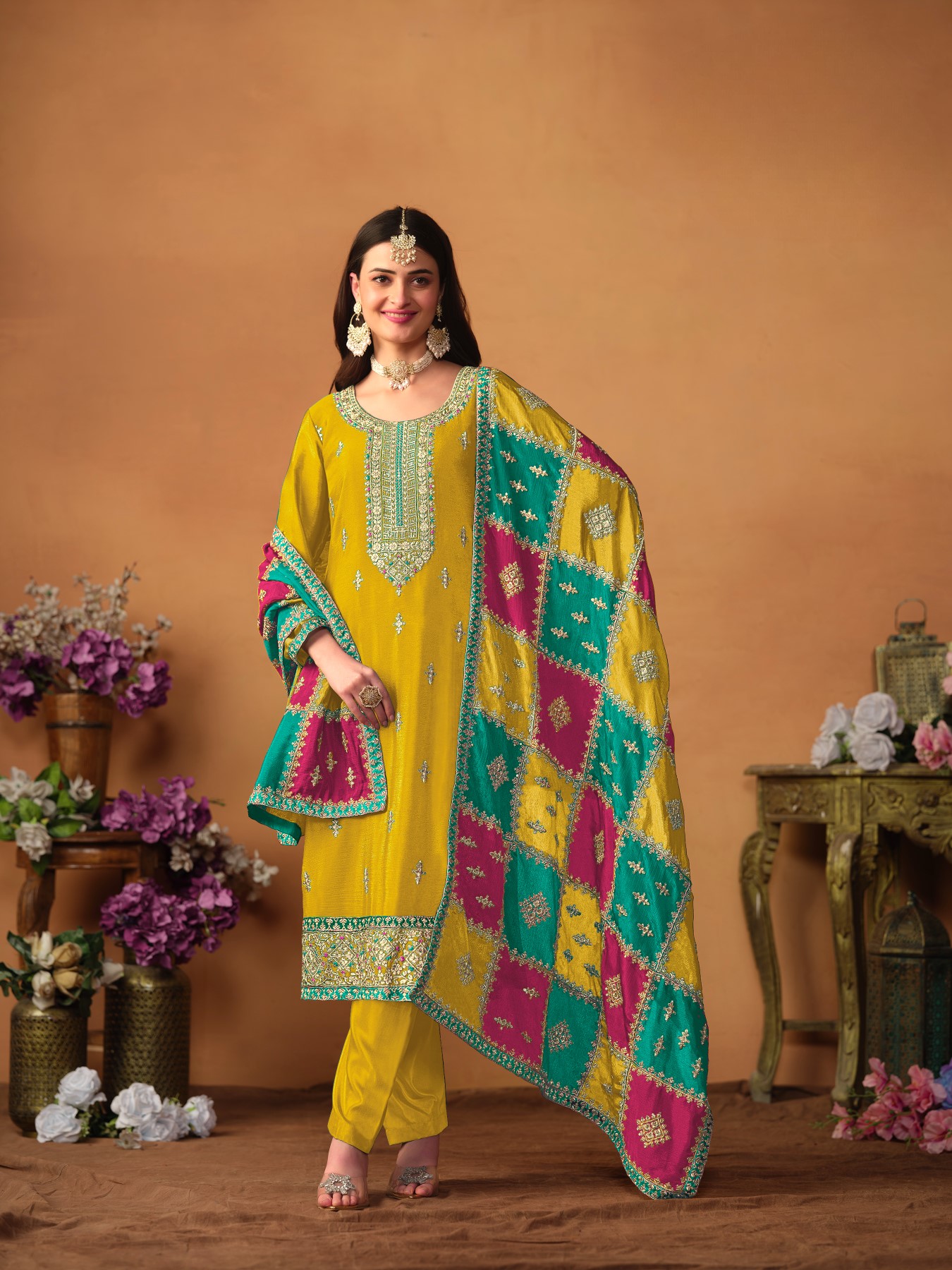 Mustard Embroidered Soft Organza Semi Stitched Salwar Suit