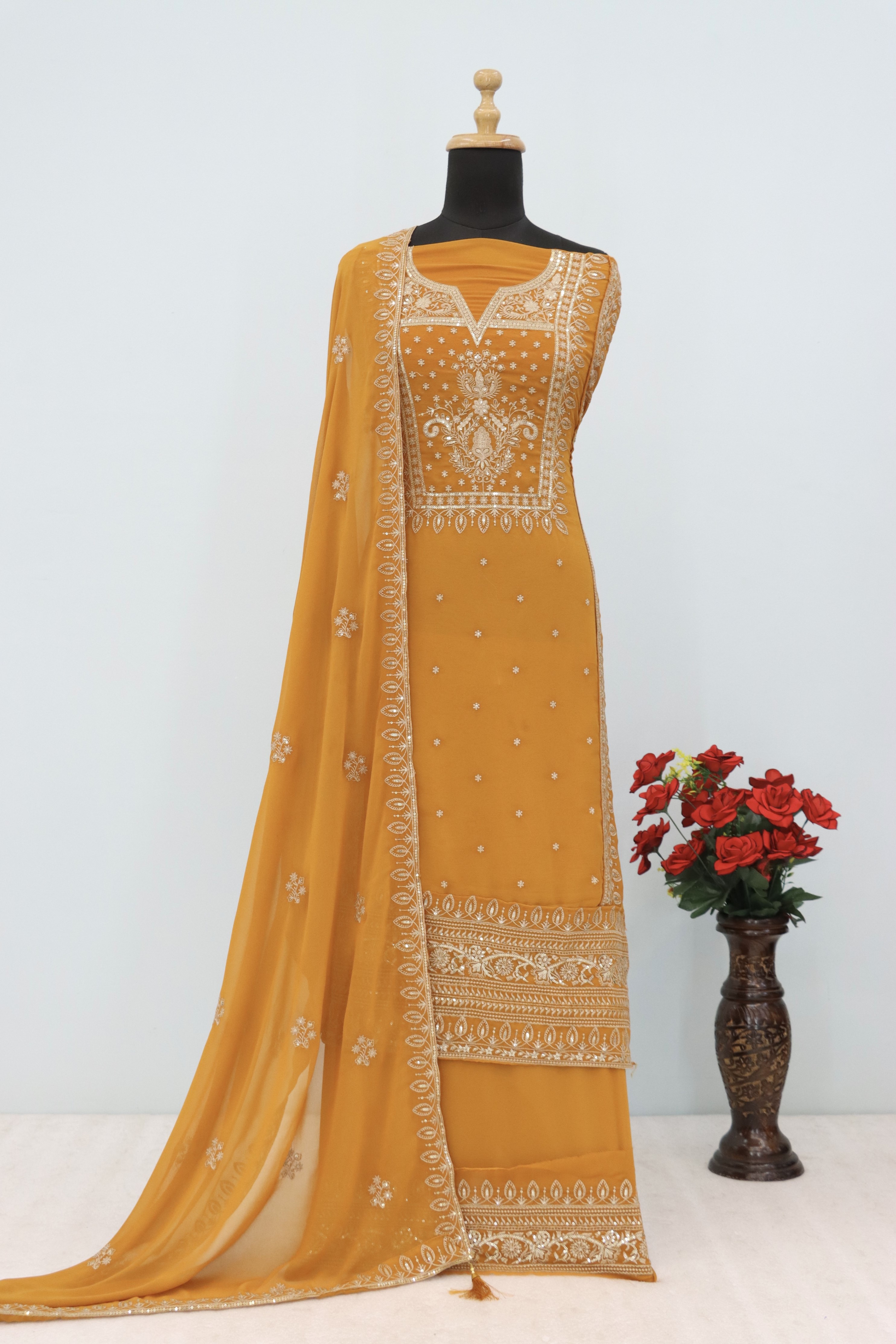 Mustard Premium Embroidered Georgette Semi Stitched Salwar Suit