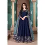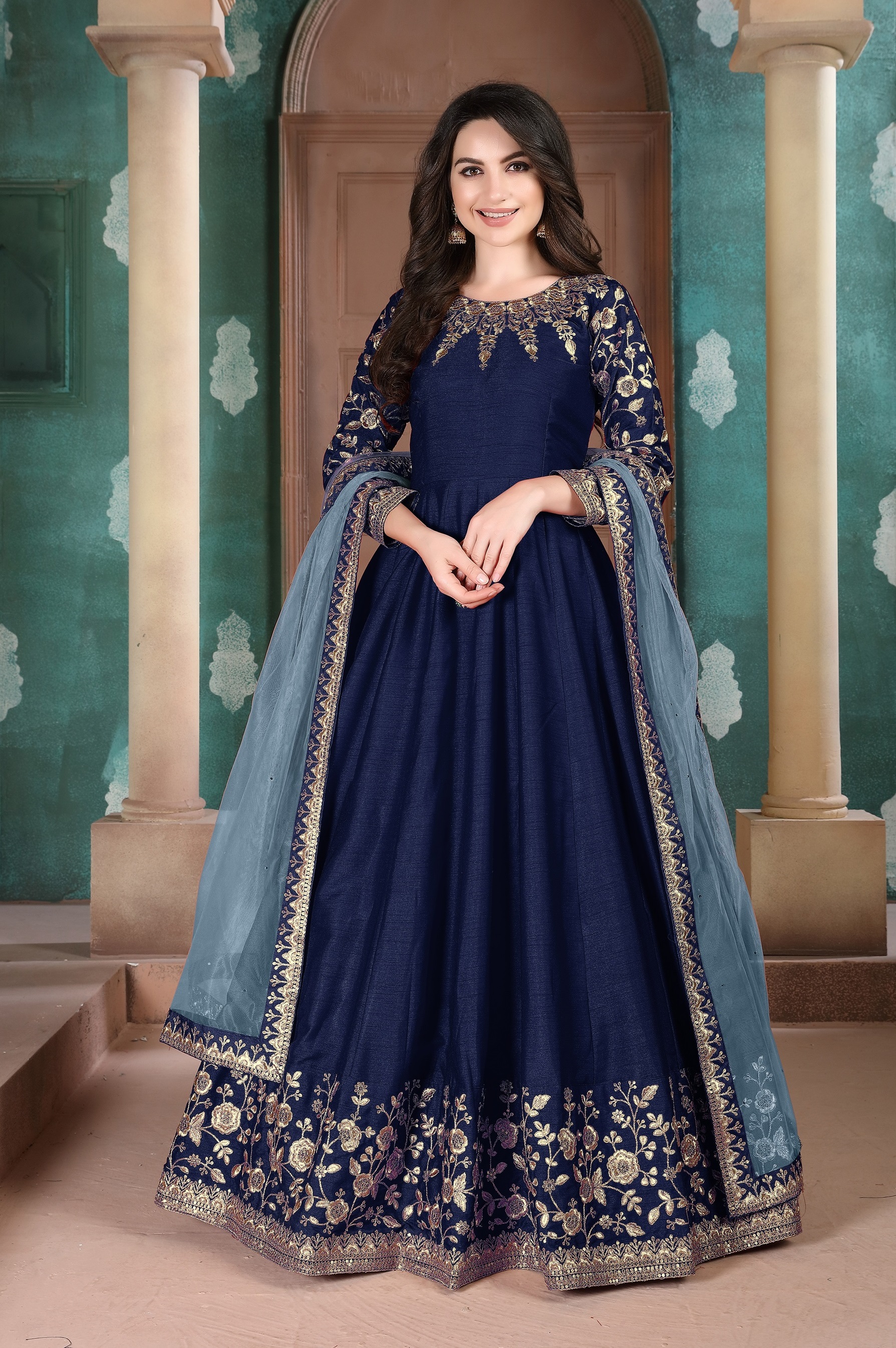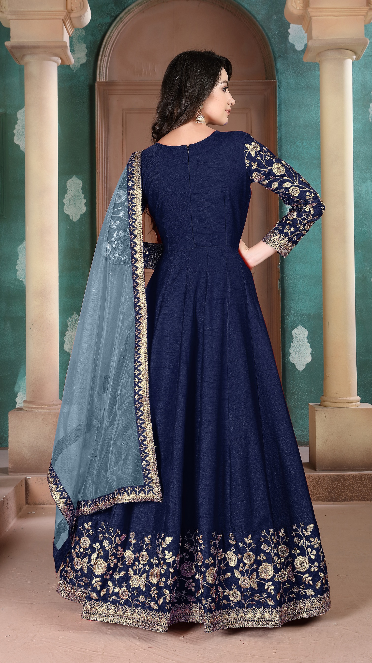 Navy Blue Embroidered Adda Silk Semi Stitched Anarkali Suit