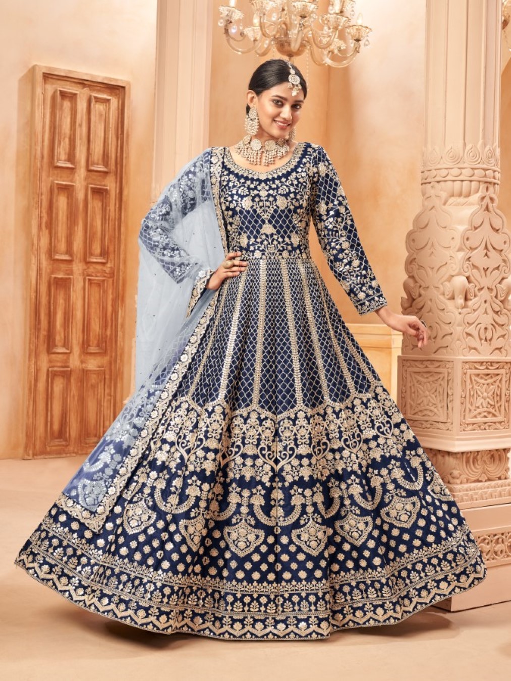 Navy Blue Embroidered Art Silk Semi Stitched Anarkali Suit