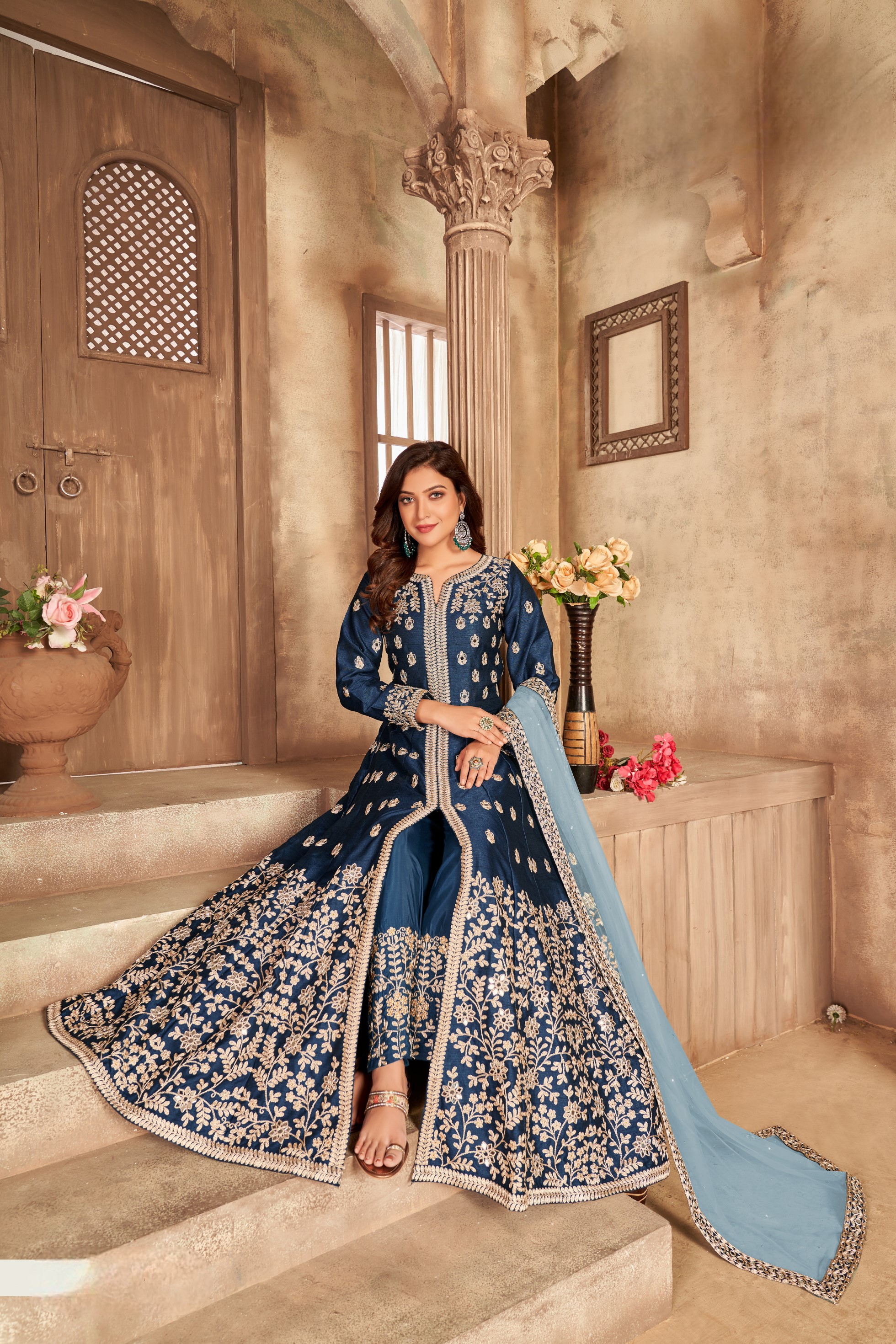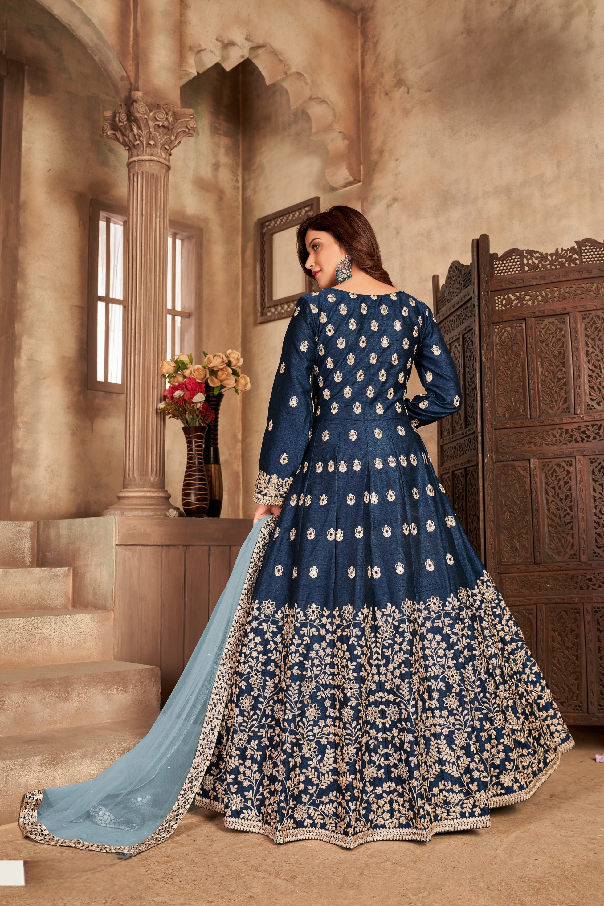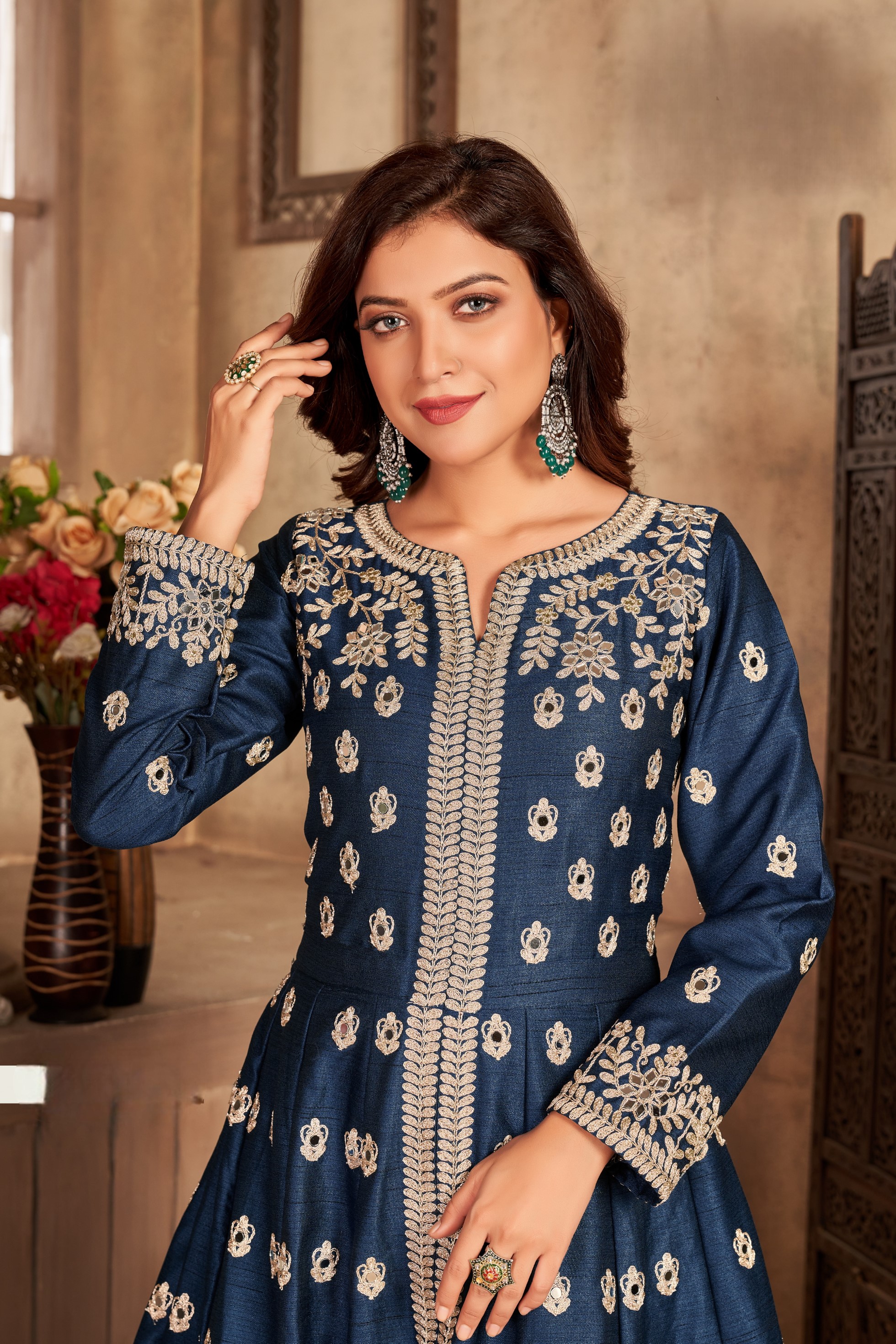 Navy Blue Embroidered Art Silk Semi Stitched Anarkali Suit