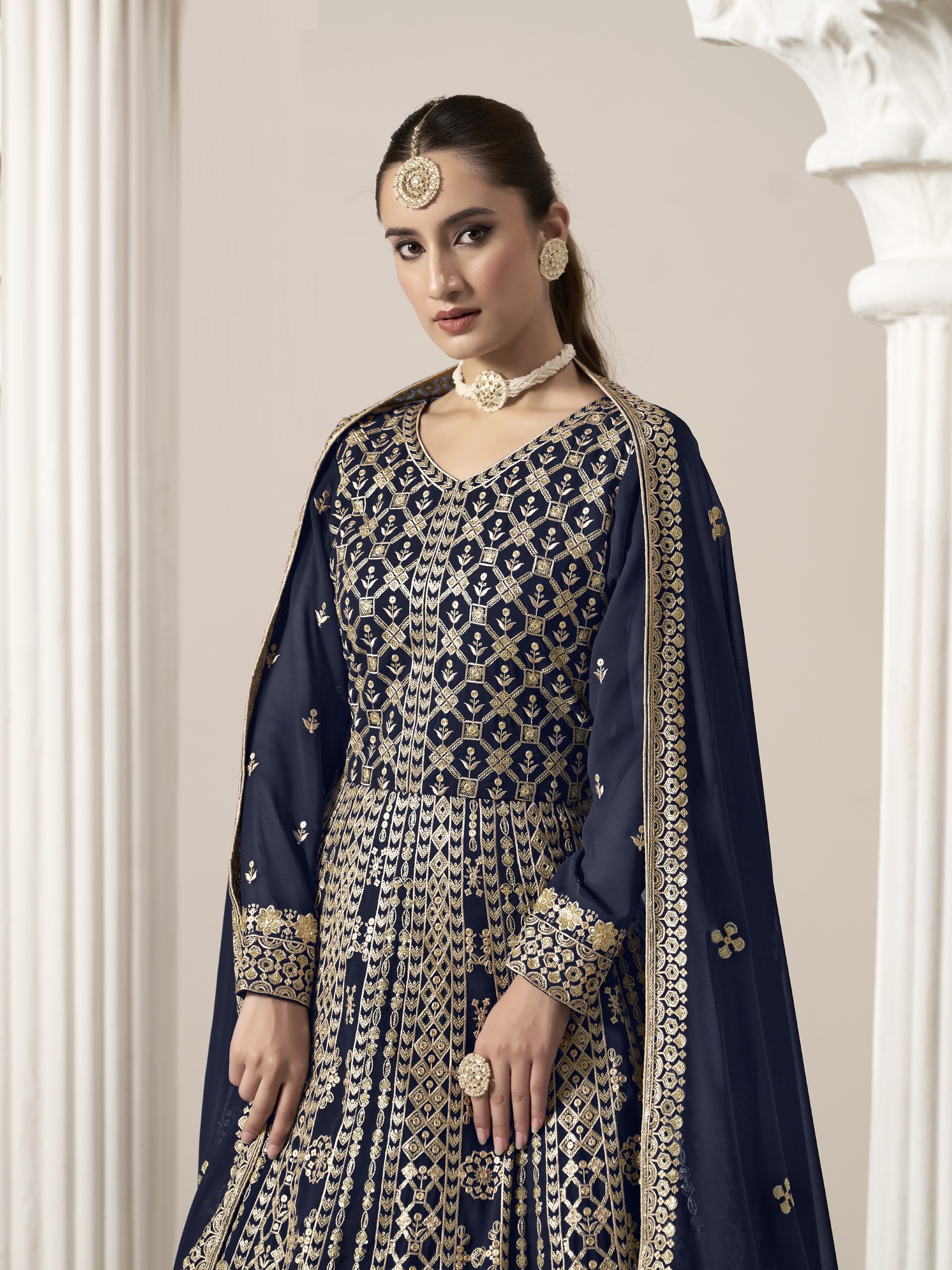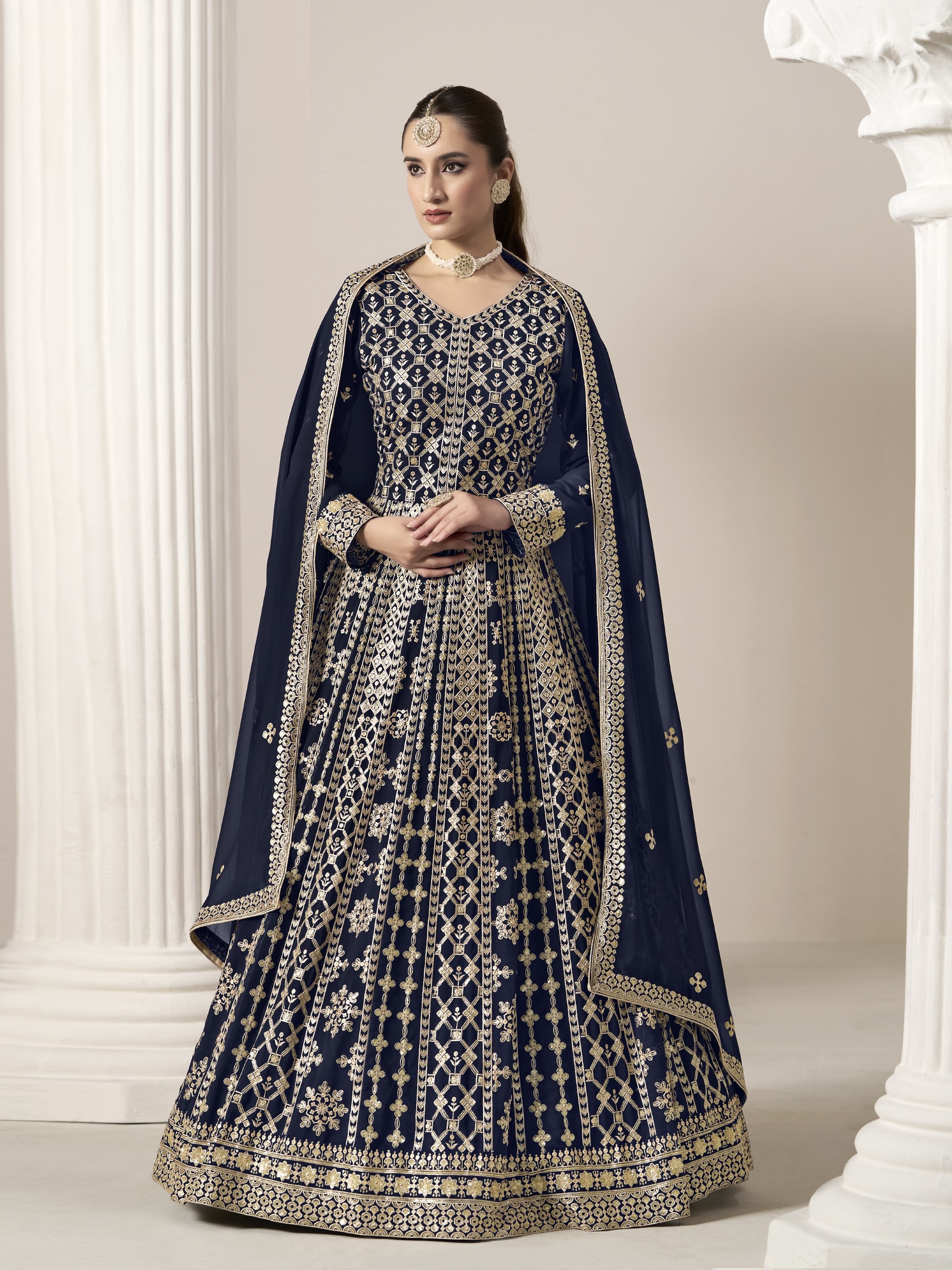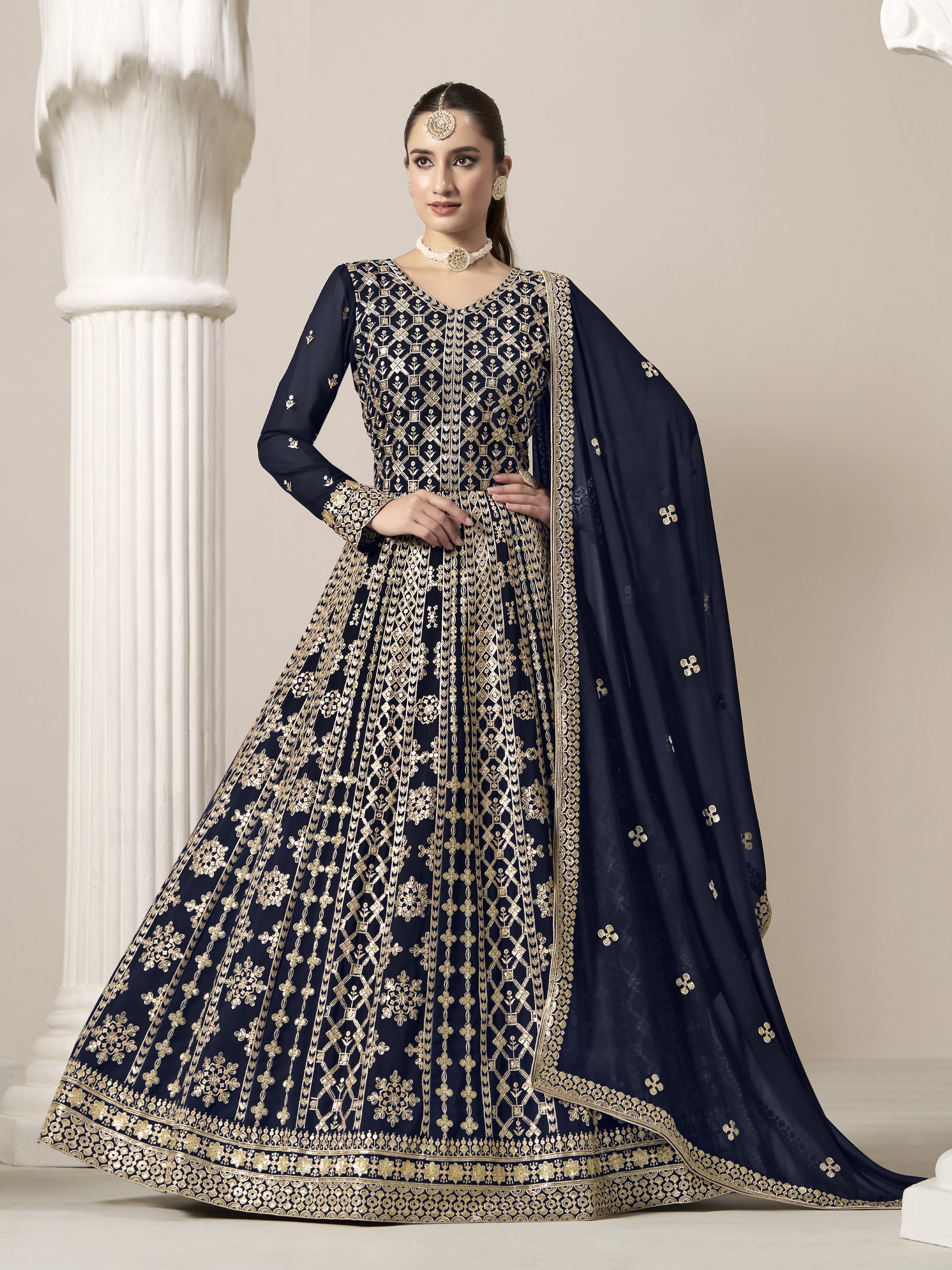 Navy Blue Embroidered Faux Georgette Semi Stitched Anarkali Suit