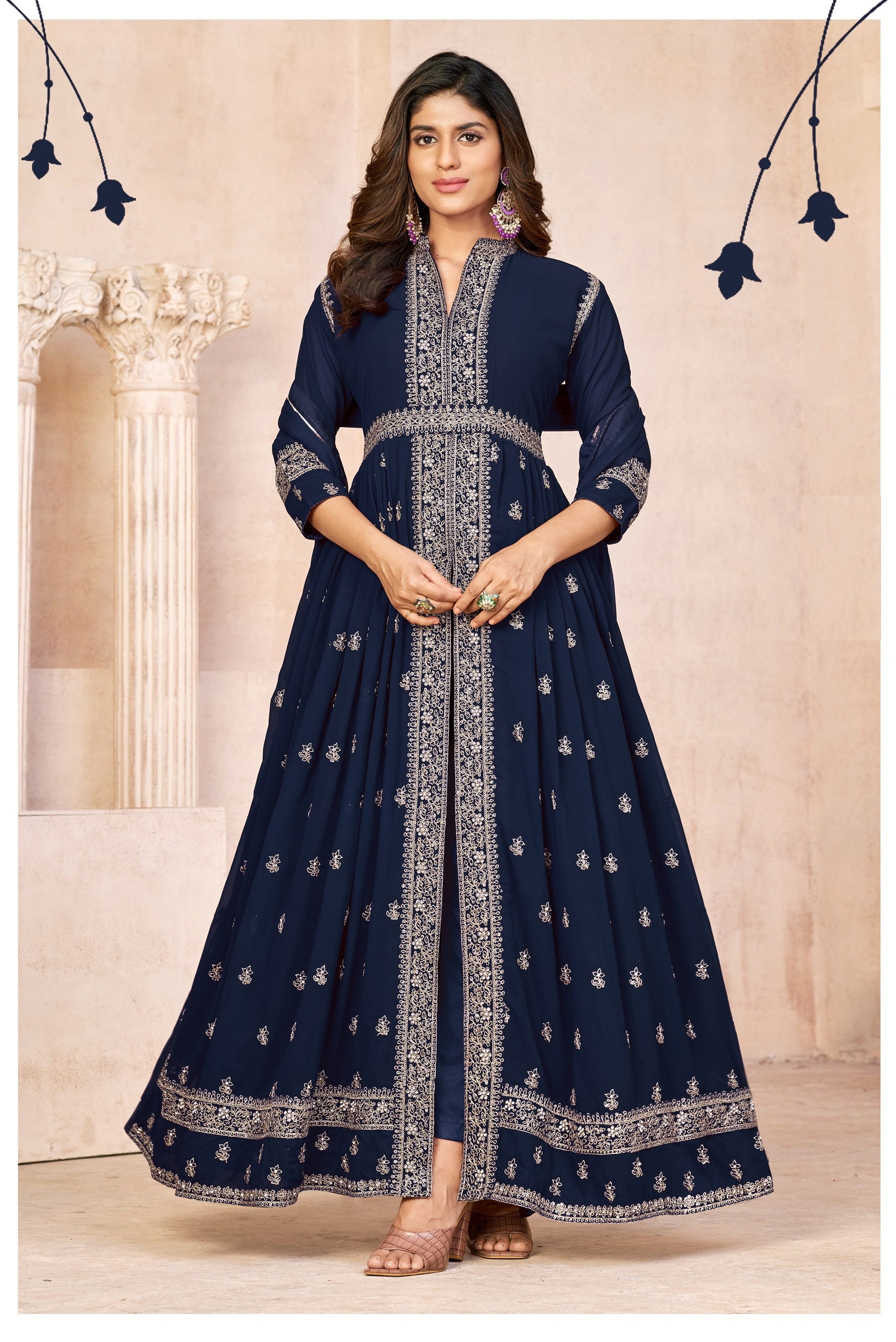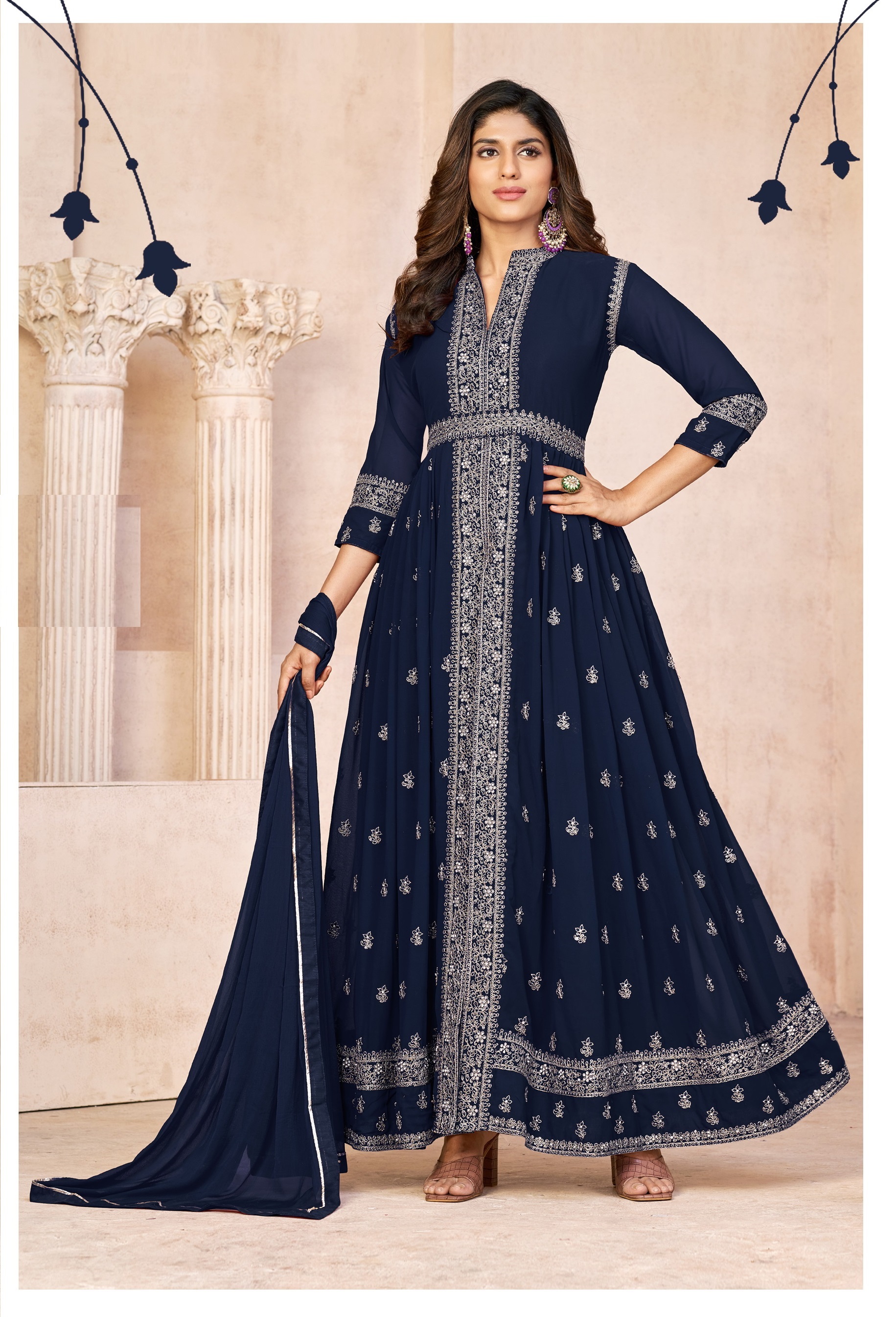 Navy Blue Embroidered Faux Georgette Semi Stitched Anarkali Suit