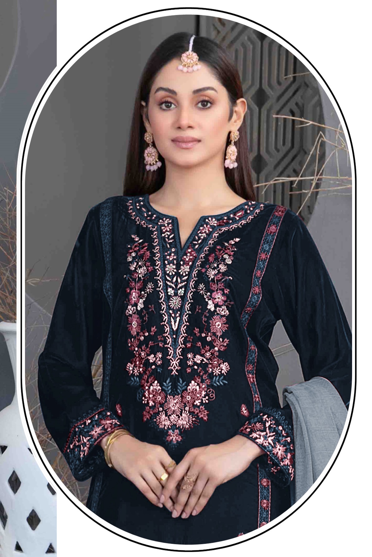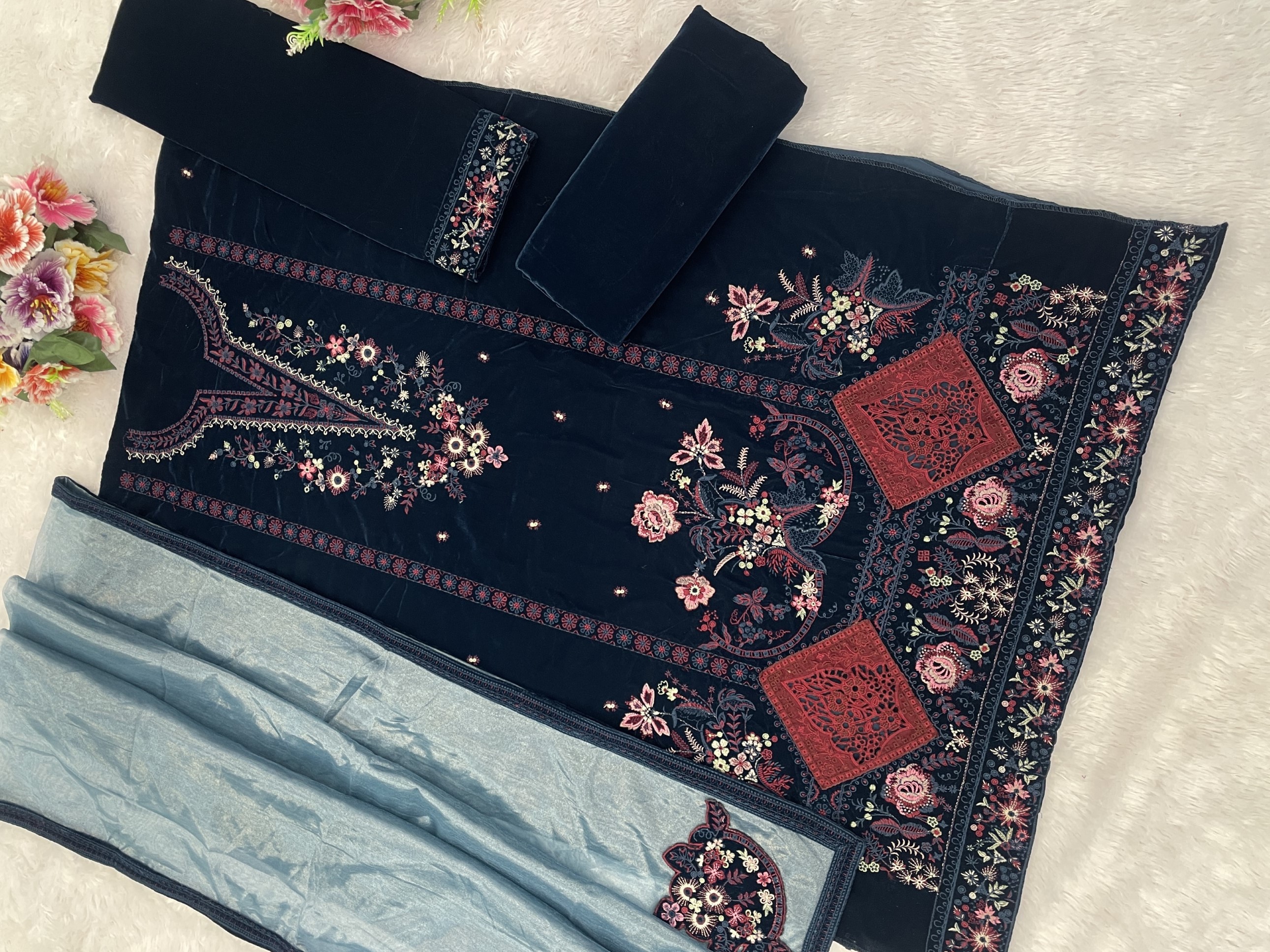 Navy Blue Velvet Semi Stitched Suit with Embroidery Sequence Work