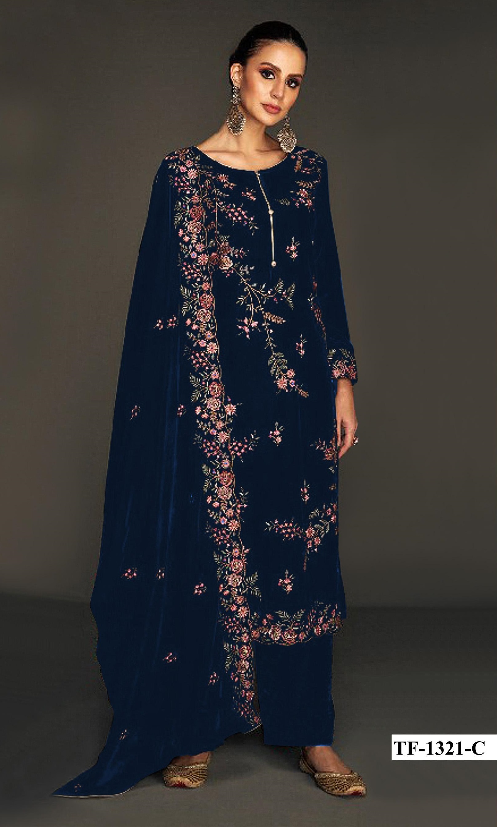 Navy Pure Velvet Semi Stitched Suit with Heavy Embroidery Sequence Work