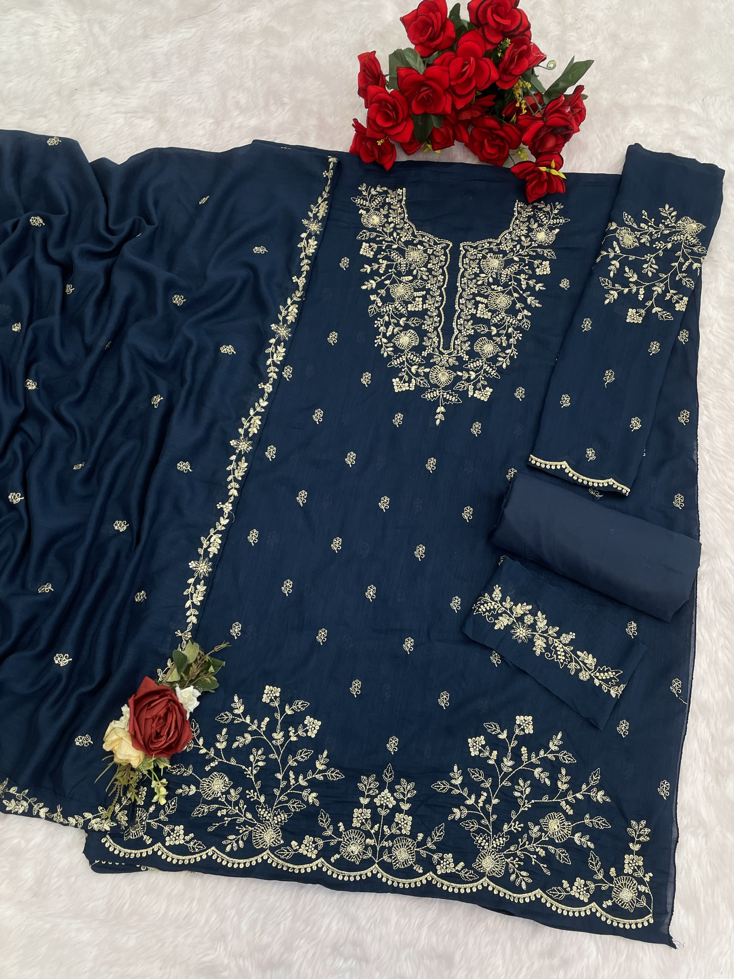 Navy Vichitra Semi Stitched Suit with Embroidered & Multi Thread Zari Work
