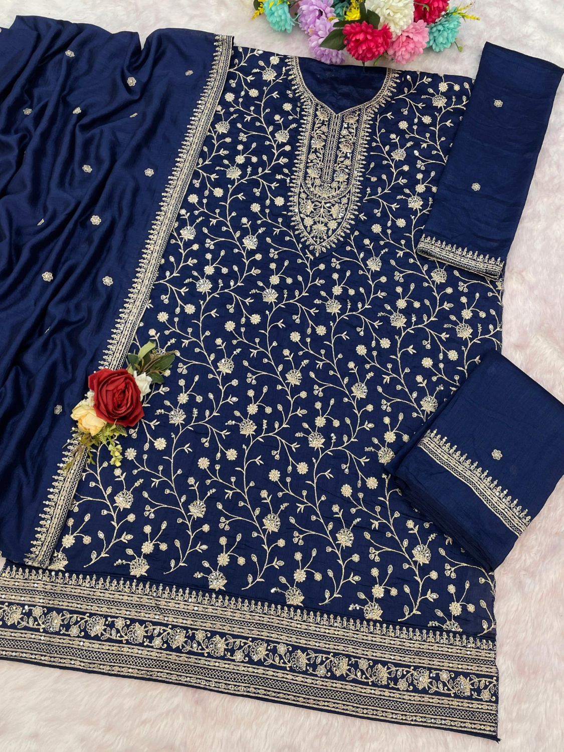 Navy vichitra semi stitched suit with heavy embroidery work