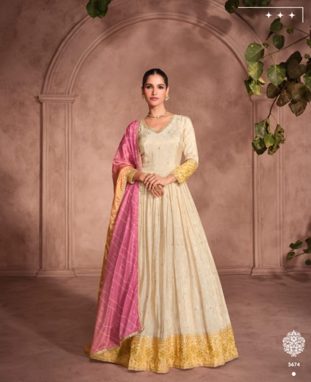 Off White & Yellow Viscos Shimmer Embroidered Readymade Anarkali Suit (Free Size)