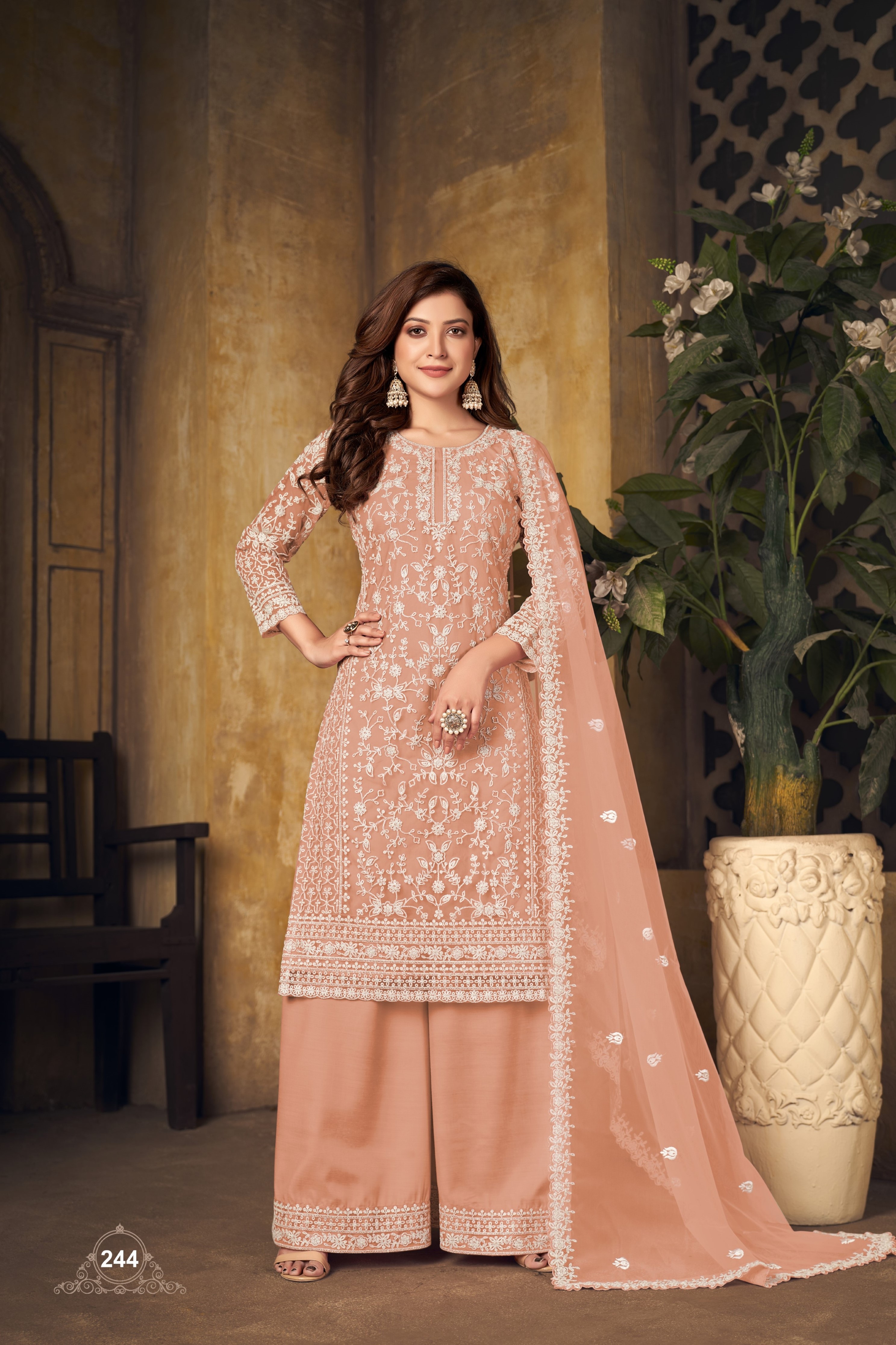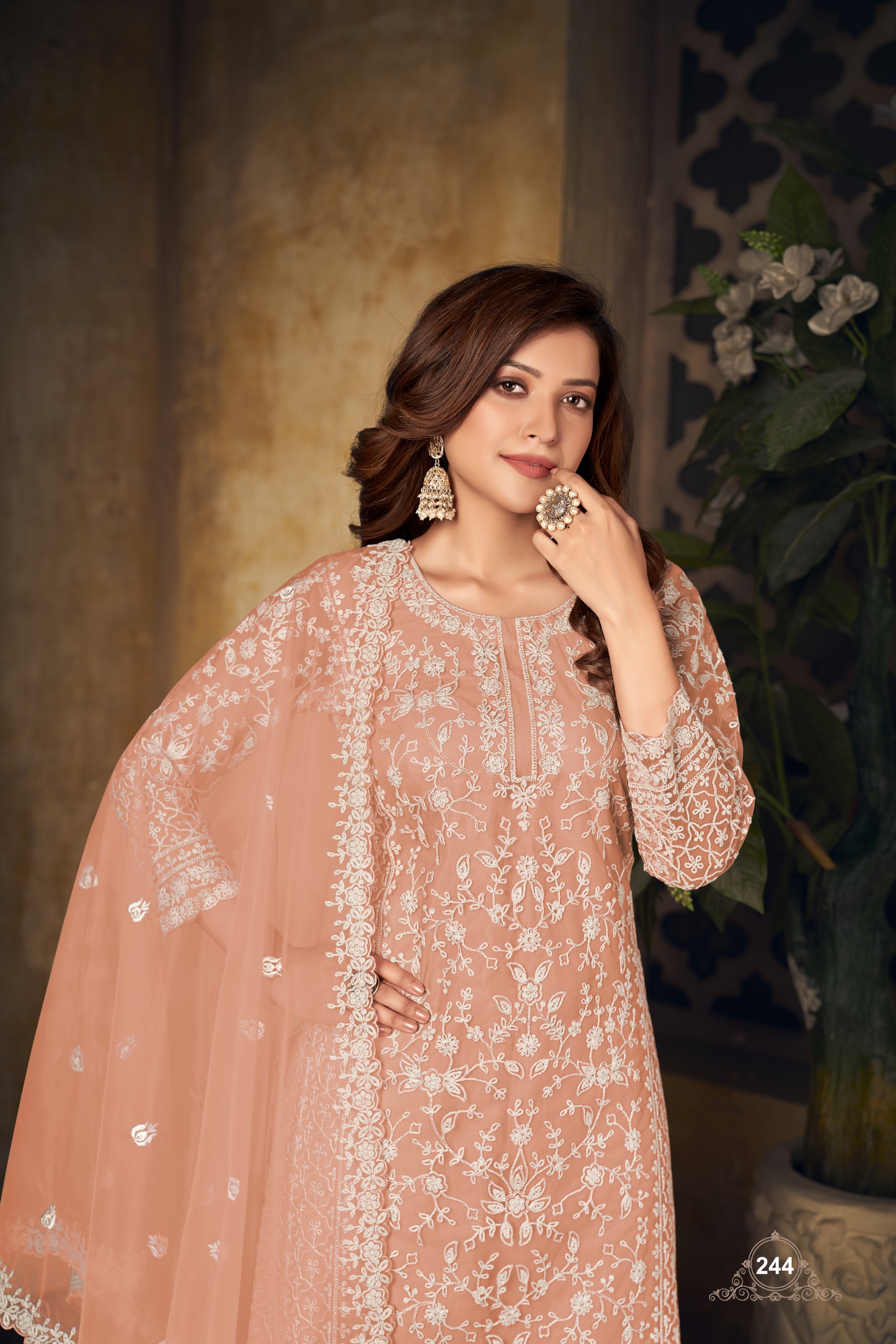 Orange Embroidered Net Semi Stitched Plazzo Suit