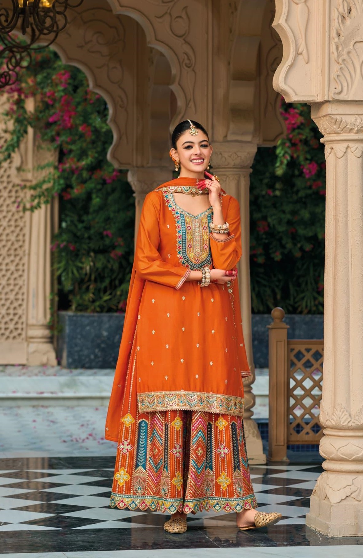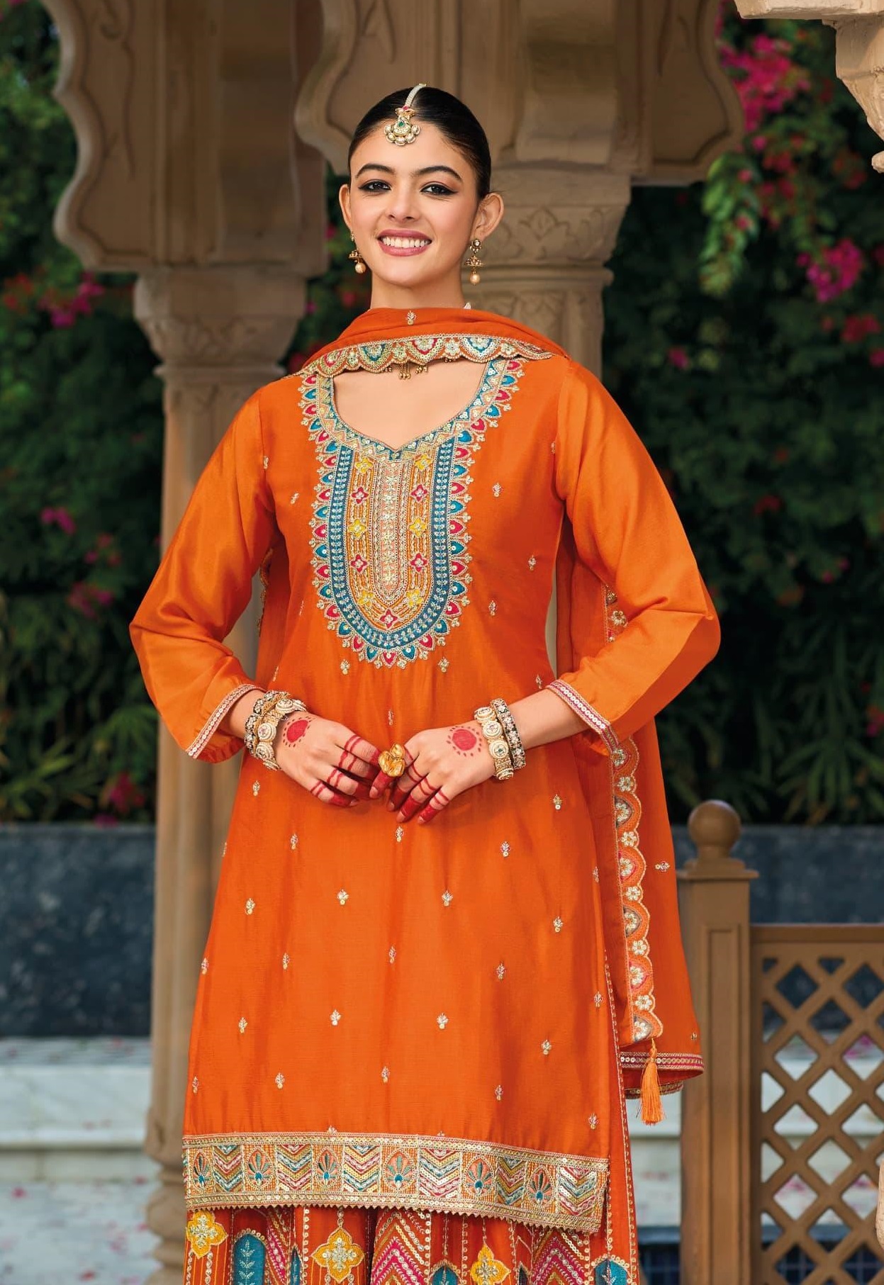 Orange Premium Embroidered Chinon Readymade Salwar Suit