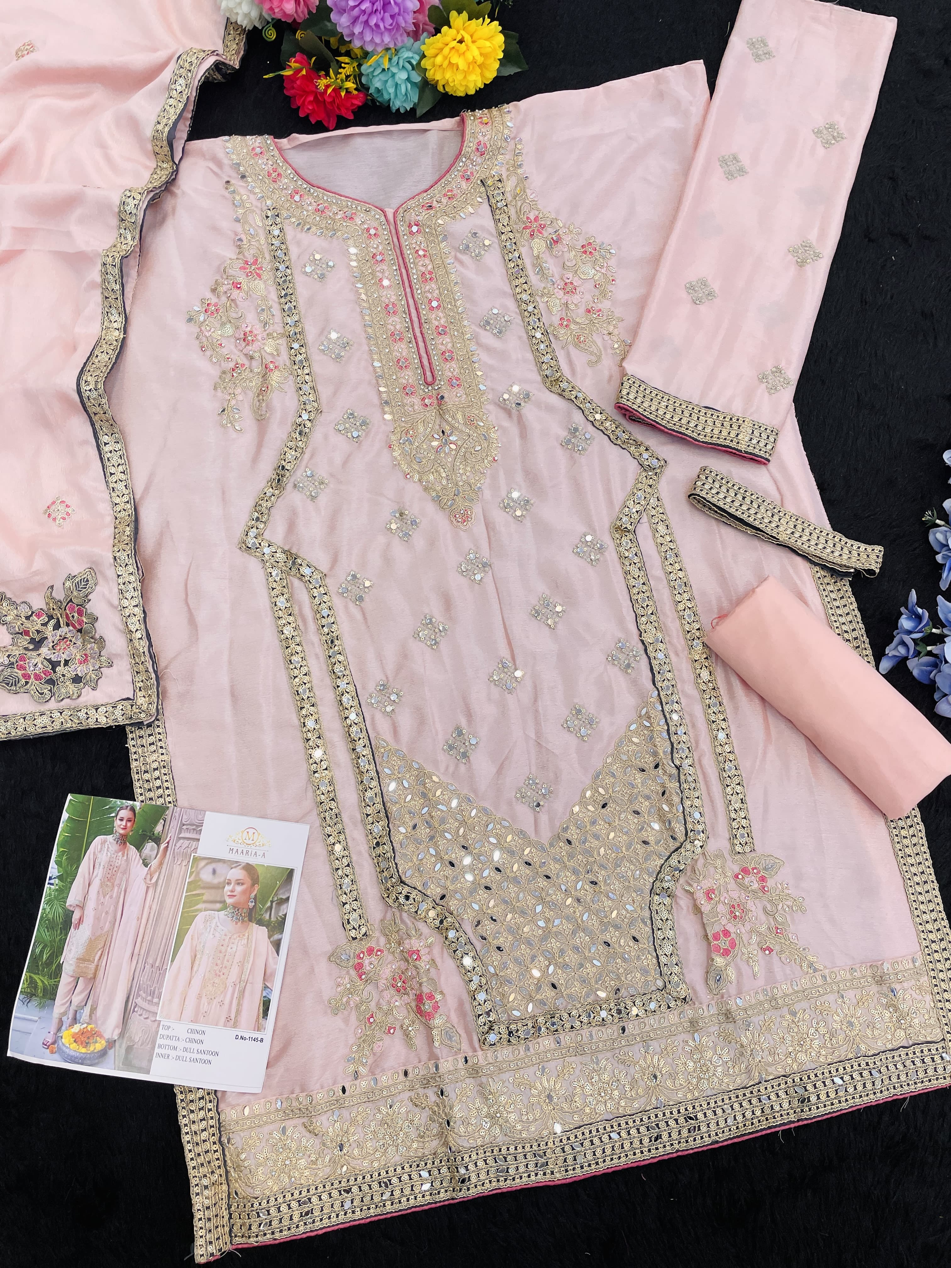 Peach Chinon With Embroidery Codding Sequence Semi-Stitched Salwar Suit