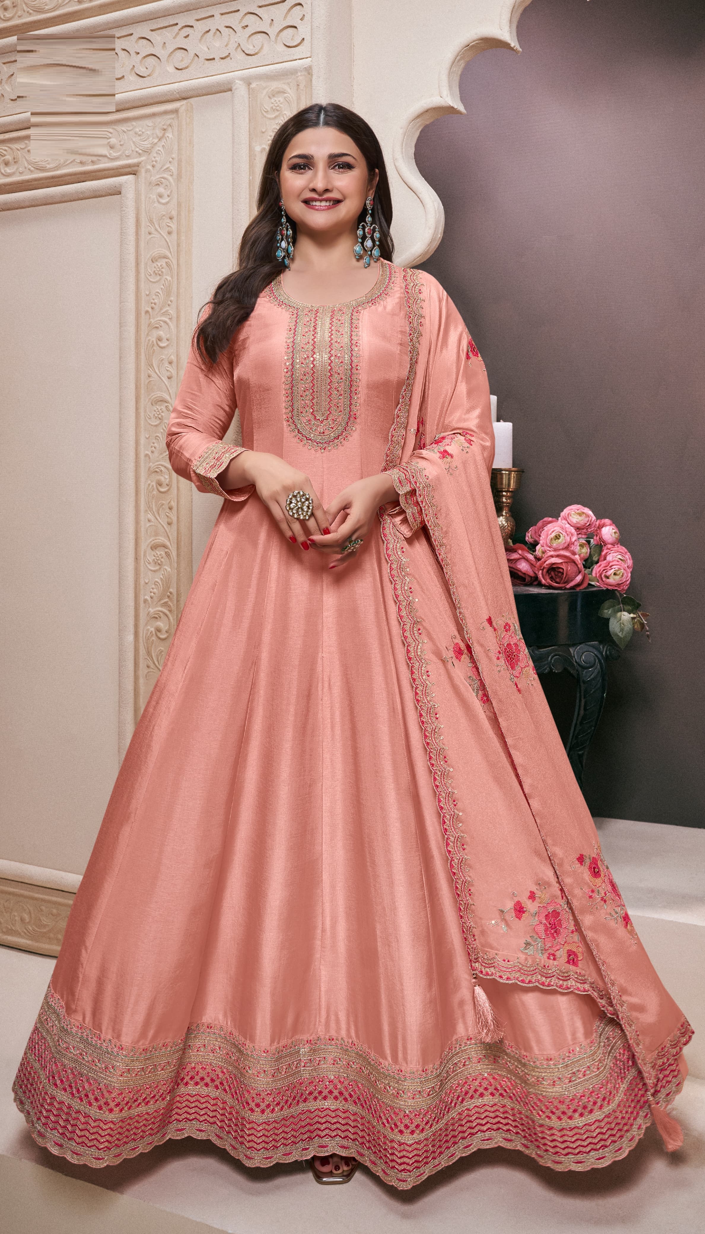 Peach Embroderied Work Silk Semi-Stitched Anarkali suit