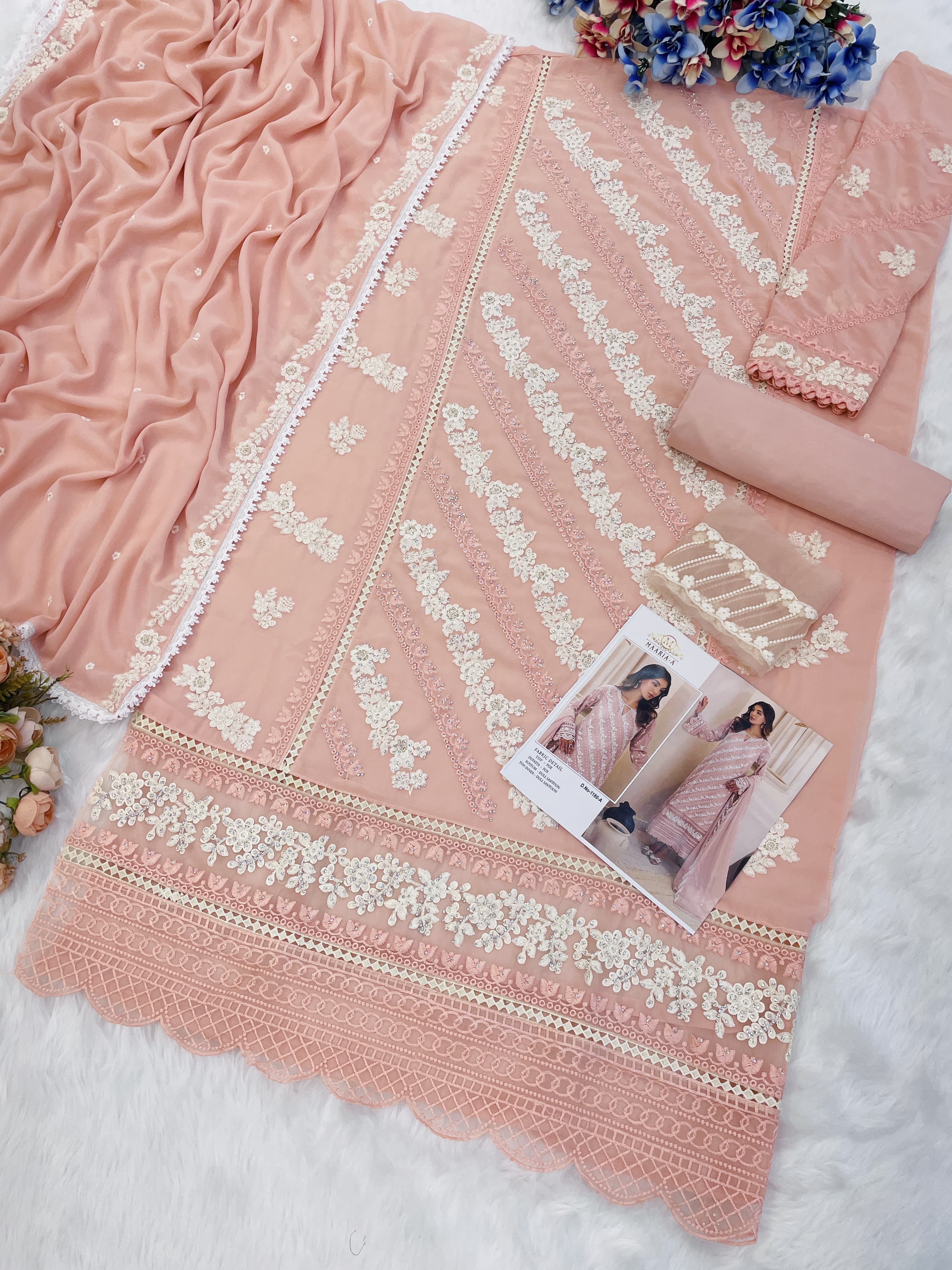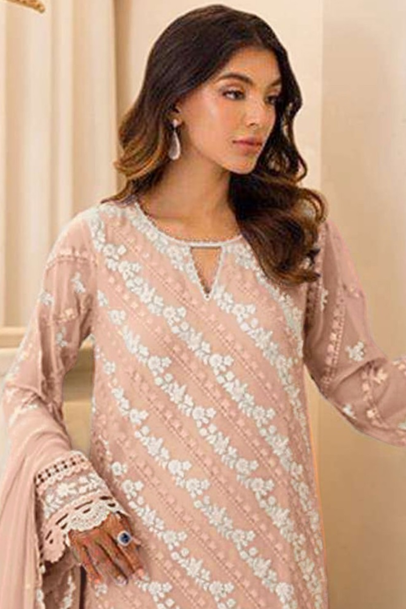 Peach embroidered sequence work heavy fox georgette unstitched suit with zarkan