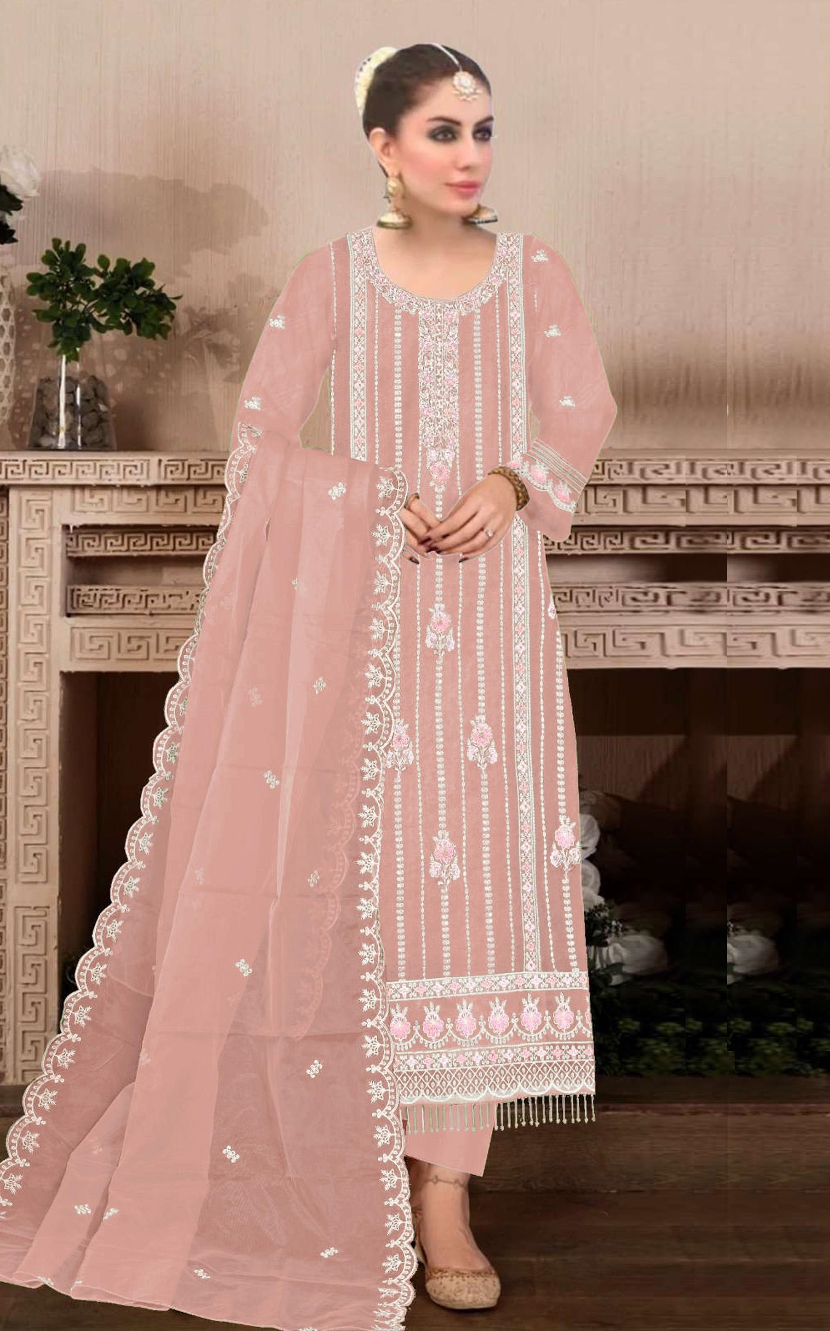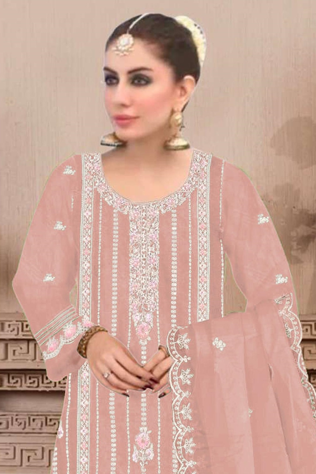 Peach Embroidered Viscose Chinon Semi Stitched Salwar Suit