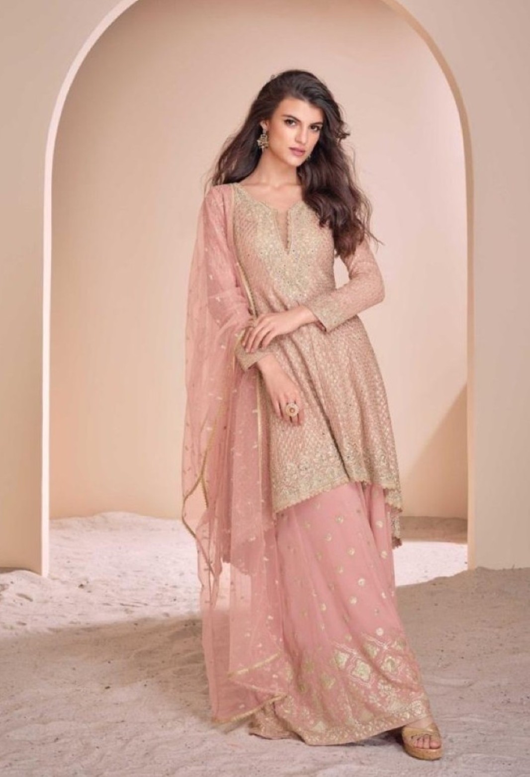 Peach Georgette Readymade Suit with Codding Dori & Sequence Work