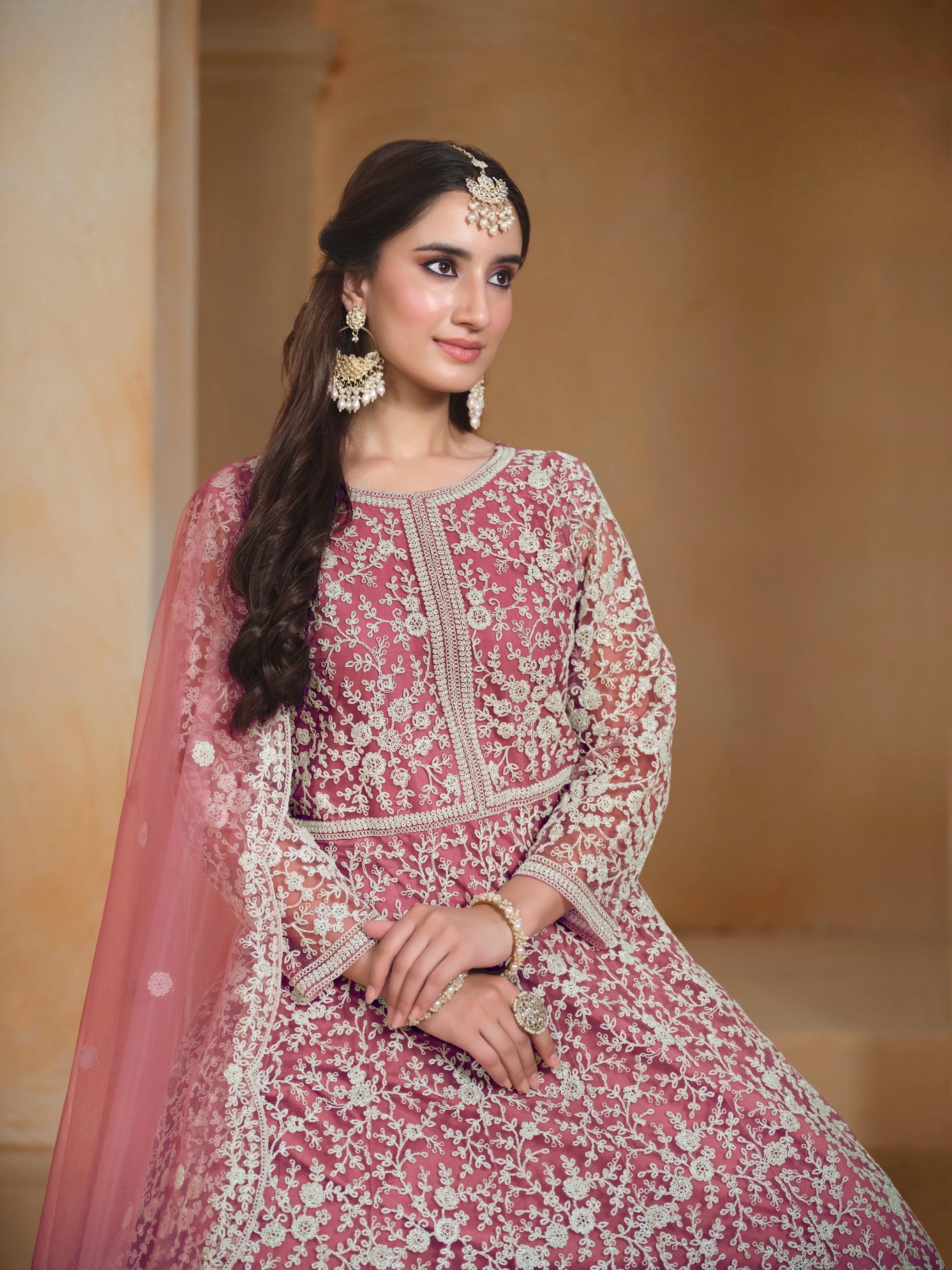 Pink Embroidered Net Semi Stitched Anarkali Suit