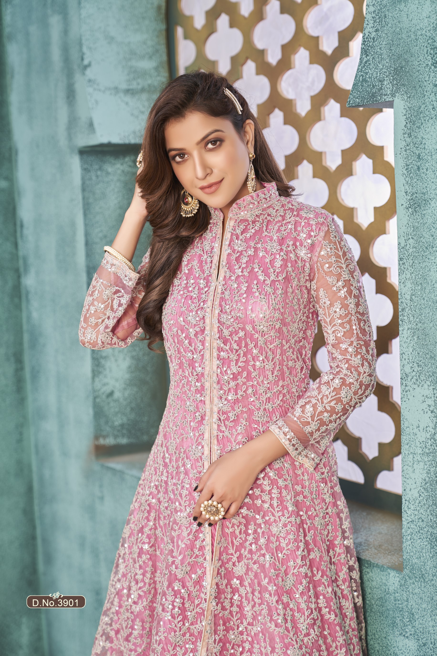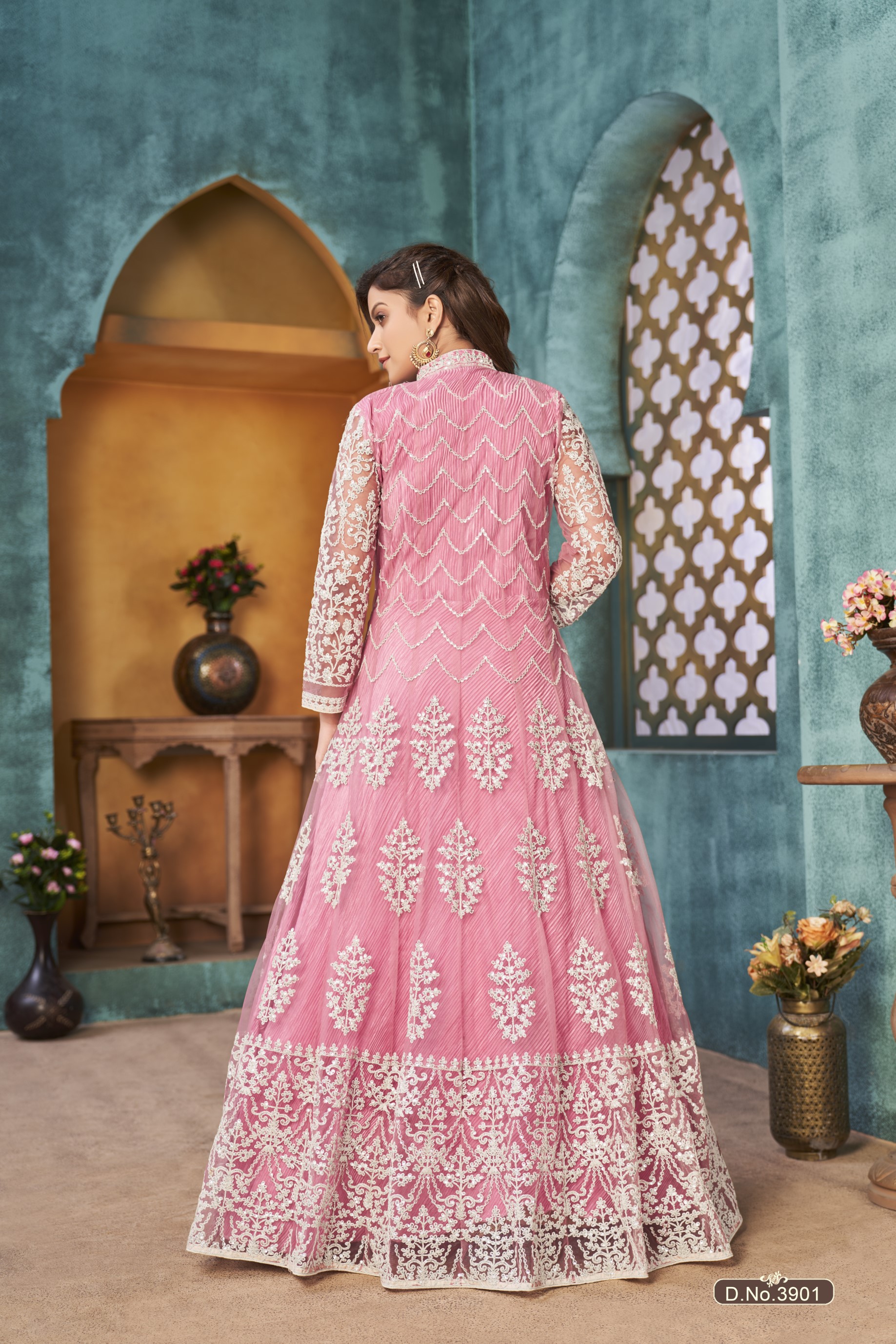 Pink Embroidered Net Semi Stitched Anarkali Suit