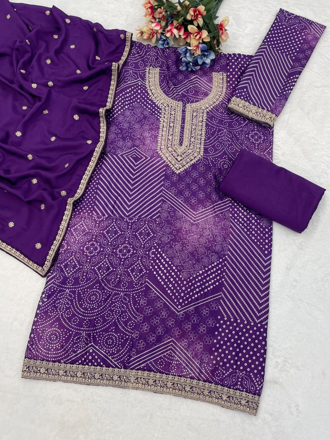 Purple Chinon Semi Stitched Suit with Digital Print & Embroidery Codding Sequence Work