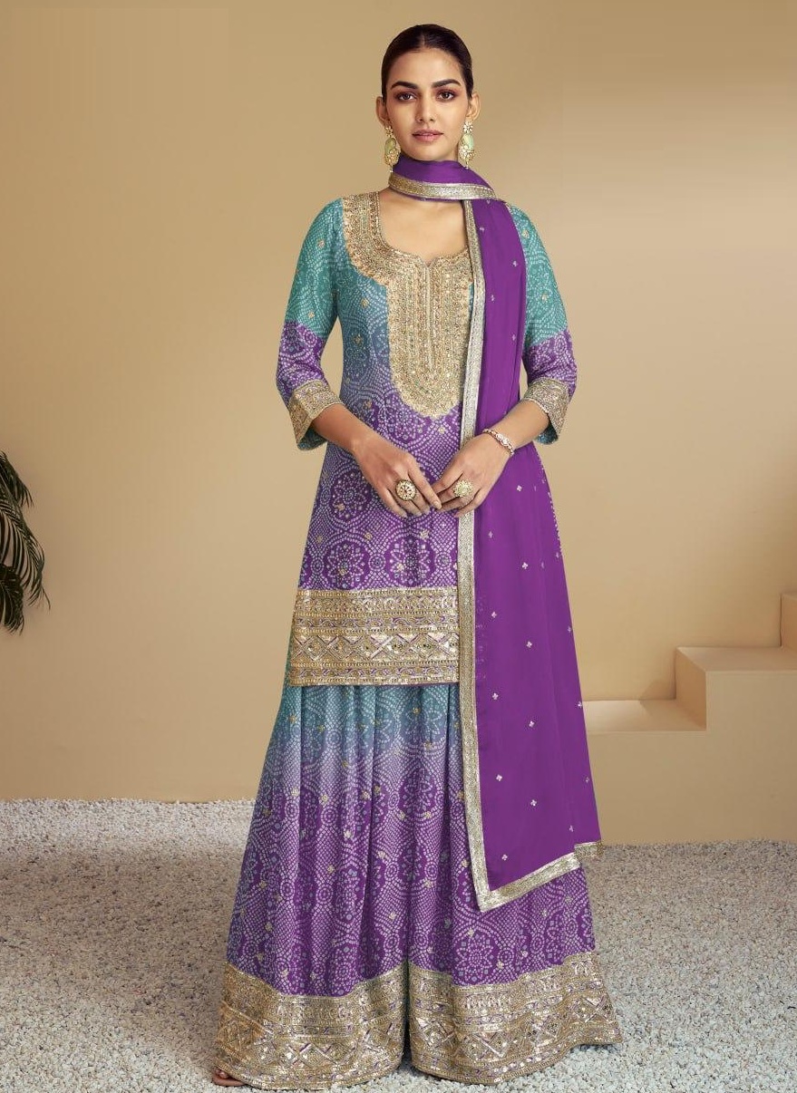 Purple Digital print with Embroderied Silk Stitched Plazo Suit(Free Size)